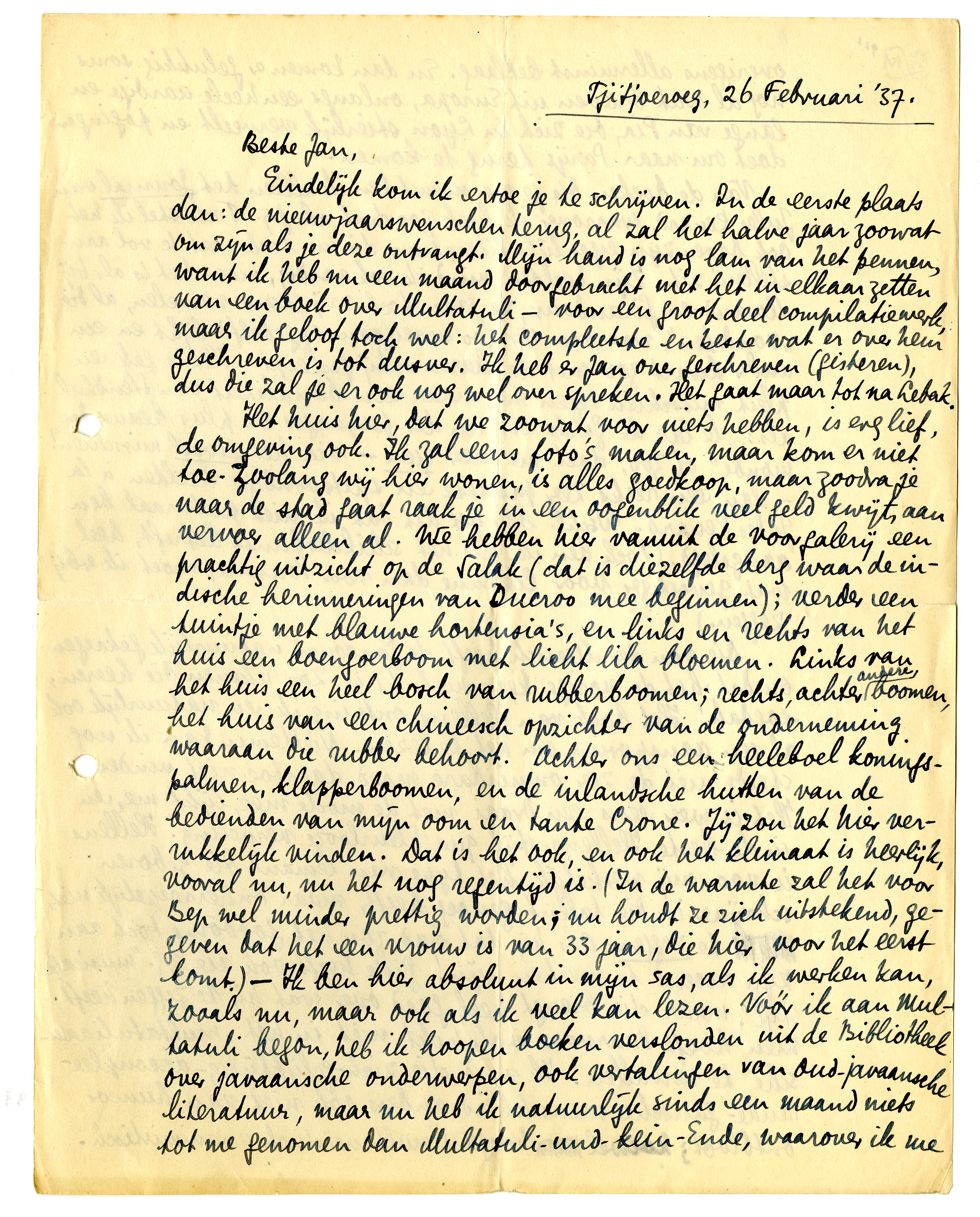Het huis hier, dat we zoowat voor niets hebben, is erg lief, de omgeving ook. Ik zal eens foto's maken, maar kom er niet toe. Zoolang wij hier wonen, is alles goedkoop, maar zoodra je naar de stad gaat raak je in een oogenblik veel geld kwijt, aan vervoer alleen al. We hebben hier vanuit de voorgalerij een prachtig uitzicht op de Salak (dat is diezelfde berg waar de indische herinneringen van Du-croo mee beginnen); verder een tuintje met blauwe hortensia's, en links en rechts van het huis een boengoerboom met licht lila bloemen. Links van het huis een heel bosch van rubberboomen; rechts, achter andere boomen, het huis van een chineesch opzichter van de onderneming waaraan die rubber behoort. Achter ons een heeleboel koningspalmen, klapperboomen, en de inlandsche hutten van de bedienden van mijn oom en tante Crone. Jij zou het hier verrukkelijk vinden. Dat is het ook, en ook het klimaat is heerlijk, vooral nu, nu het nog regentijd is. (In de warmte zal het voor Bep wel minder prettig worden; nu houdt ze zich uitstekend, gegeven dat het een vrouw is van 33 jaar, die hier voor het eerst komt.) - Ik ben hier absoluut in mijn sas, als ik werken kan, zooals nu, maar ook als ik veel kan lezen. Vóór ik aan Multatuli begon, heb ik hoopen boeken verslonden uit de Bibliotheek over javaansche onderwerpen, ook vertalingen van oud-javaansche literatuur, maar nu heb ik natuurlijk sinds een maand niets tot me genomen dan Multatuli-und-kein-Ende, waarover ik me overigens allerminst beklaag. En dan komen er gelukkig soms nog al wat brieven uit Europa, onlangs een heele aardige en lange van Pia, die zich in Lyon stierlijk verveelt en pogingen doet om naar Parijs terug te komen.