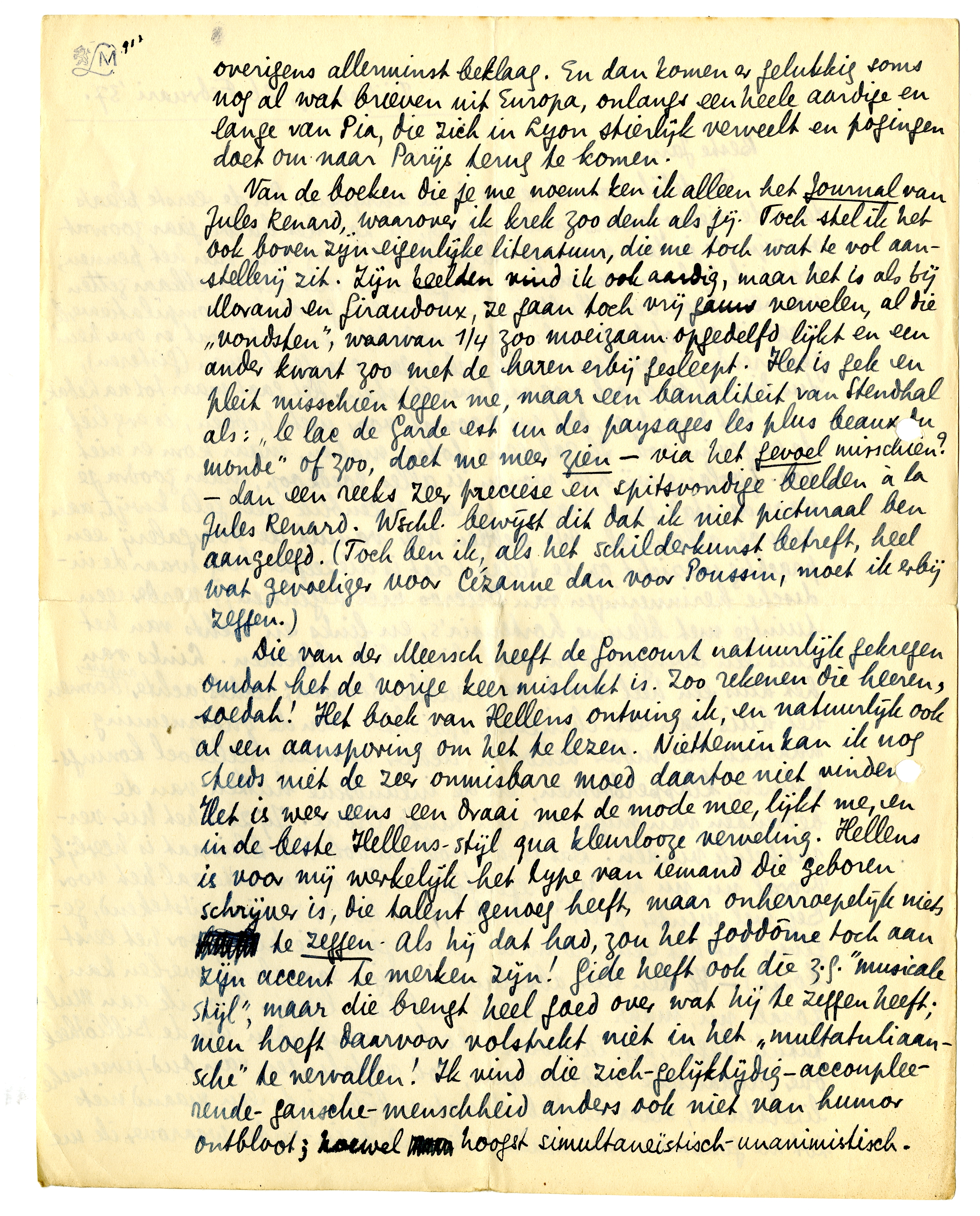 Die van der Meersch heeft de Goncourt4482 natuurlijk gekregen omdat het de vorige keer mislukt is. Zoo rekenen die heeren, soedah! Het boek van Hellens4483 ontving ik, en natuurlijk ook al een aansporing om het te lezen. Niettemin kan ik nog steeds niet de zeer onmisbare moed daartoe niet vinden. Het is weer eens een draai met de mode mee, lijkt me, en in de beste Hellens-stijl qua kleurlooze verveling. Hellens is voor mij werkelijk het type van iemand die geboren schrijver is, die talent genoeg heeft, maar onherroepelijk niets te zeggen. Als hij dat had, zou het goddôme toch aan zijn accent te merken zijn! Gide heeft ook die z.g. ‘musicale stijl’, maar die brengt heel goed over wat hij te zeggen heeft; men hoeft daarvoor volstrekt niet in het ‘multatuliaansche’ te vervallen! Ik vind die zich-gelijktijdig-accoupleerende-gansche-menschheid anders ook niet van humor ontbloot; hoewel hoogst simultaneïstisch-unanimistisch.