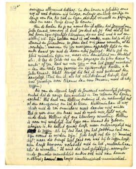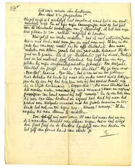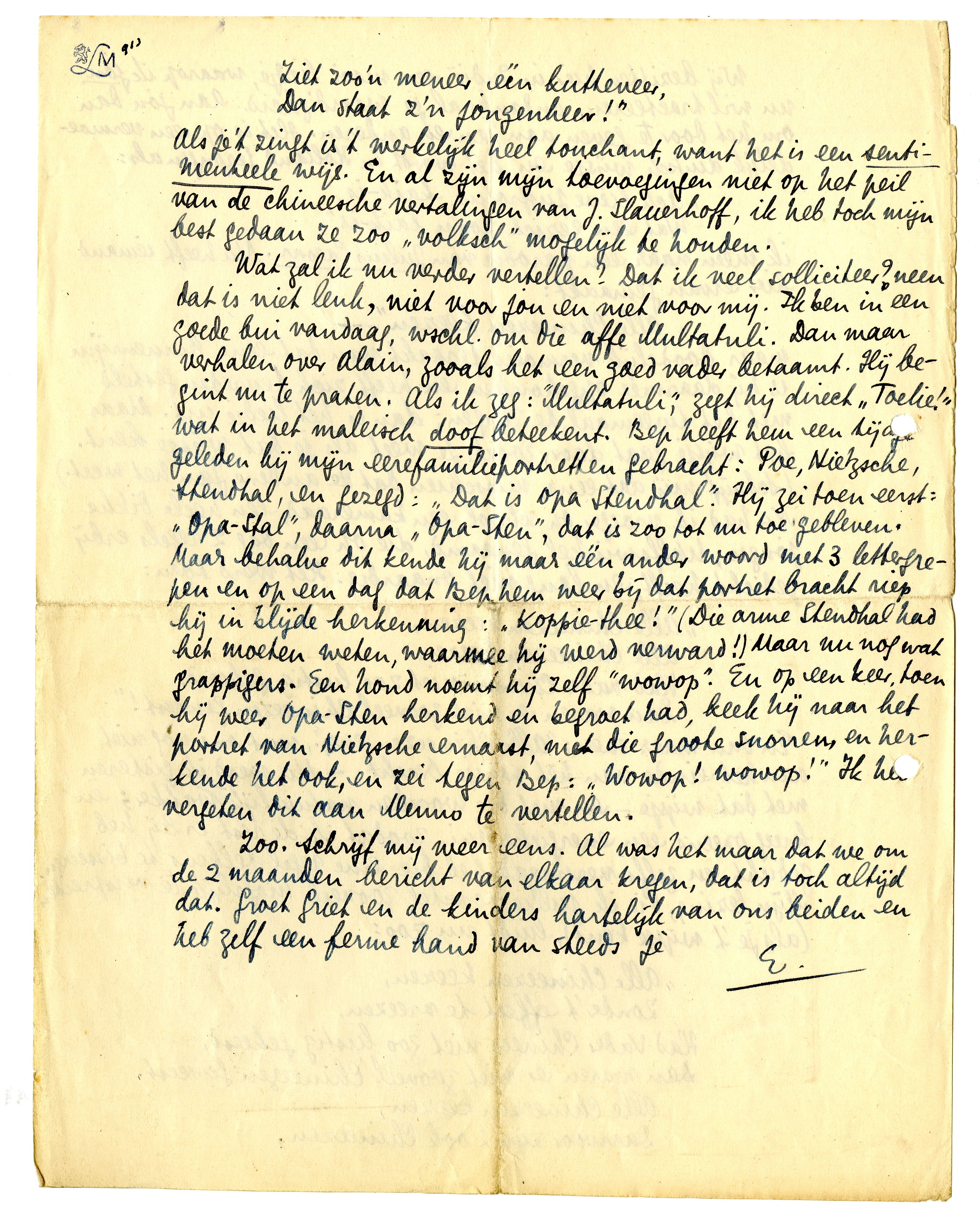 Wat zal ik nu verder vertellen? Dat ik veel solliciteer? nee, dat is niet leuk, niet voor jou en niet voor mij. Ik ben in een goede bui vandaag, wschl. om die affe Multatuli. Dan maar verhalen over Alain, zooals het een goed vader betaamt. Hij begint nu te praten. Als ik zeg: ‘Multatuli,’ zegt hij direkt ‘Toelie’ wat in het maleisch doof beteekent. Bep heeft hem een tijdje geleden bij mijn eerefamilieportretten gebracht: Poe, Nietzsche, Stendhal, en gezegd: ‘Dat is opa Stendhal’. Hij zei toen eerst ‘Opa-Stal’, daarna ‘Opa-Sten’, dat is zoo tot nu toe gebleven. Maar behalve dit kende hij maar één ander woord met 3 lettergrepen en op een dag dat Bep hem weer bij dat portret bracht riep hij in blijde herkenning: ‘Koppie-thee!’ (Die arme Stendhal had het moeten weten, waarmee hij werd verward!) Maar nu nog wat grappigers. Een hond noemt hij zelf ‘wowop’. En op een keer, toen hij weer Opa-Sten herkend en begroet had, keek hij naar het portret van Nietzsche ernaast, met die grootse snorren, en herkende het ook, en zei tegen Bep: ‘Wowop! wowop!’ Ik heb vergeten dit aan Menno te vertellen.