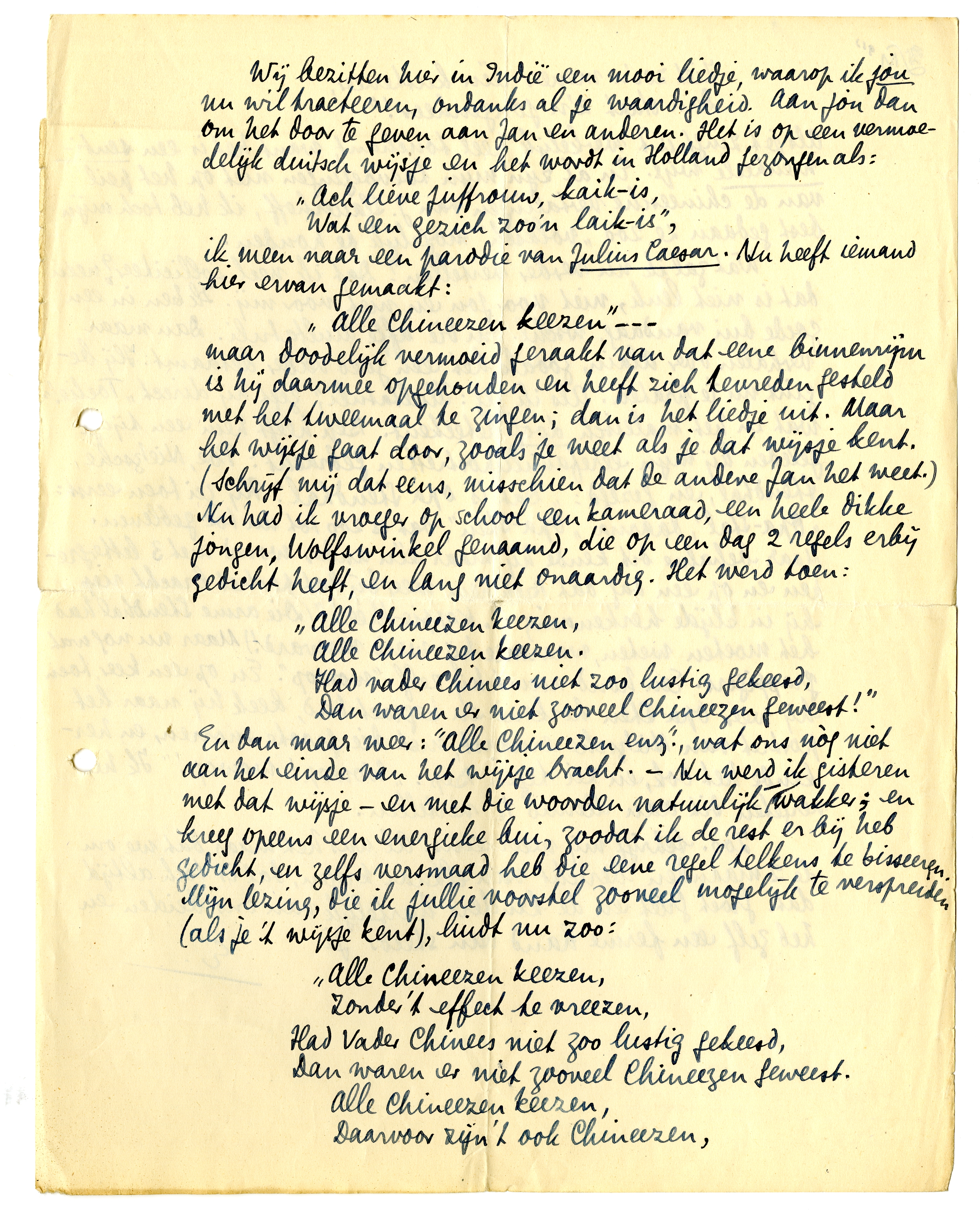 Wij bezitten hier in Indië een mooi liedje, waarop ik jou nu wil tracteeren, ondanks al je waardigheid. Aan jou dan om het door te geven aan Jan en anderen. Het is op een vermoedelijk duitsch wijsje en het wordt in Holland gezongen als: