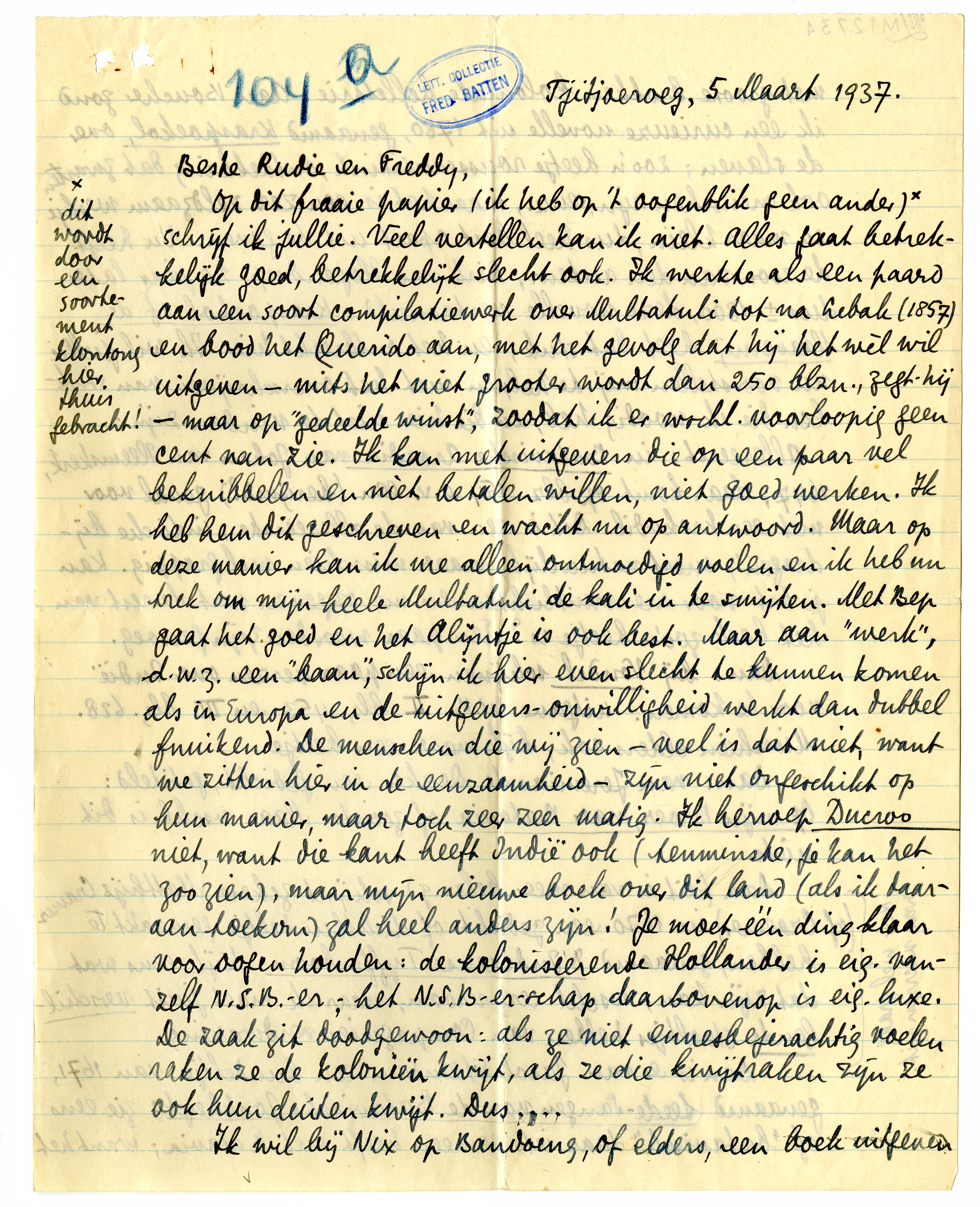 Op dit fraaie papier (ik heb op 't oogenblik geen ander)* schrijf ik jullie. Veel vertellen kan ik niet. Alles gaat betrekkelijk goed, betrekkelijk slecht ook. Ik werkte als een paard aan een soort compilatiewerk over Multatuli tot na Lebak (1857) en bood het Querido aan, met het gevolg dat hij het wèl wil uitgeven - mits het niet grooter wordt dan 250 blzn., zegt hij - maar op ‘gedeelde winst’, zoodat ik er wschl. voorloopig geen cent van zie. Ik kan met uitgevers die op een paar vel beknibbelen en niet betalen willen, niet goed werken. Ik heb hem dit geschreven en wacht nu op antwoord. Maar op deze manier kan ik me alleen ontmoedigd voelen en ik heb nu trek om mijn heele Multatuli de kali in te smijten. Met Bep gaat het goed en het Alijntje is ook best. Maar aan ‘werk’, d.w.z. een ‘baan’, schijn ik hier even slecht te kunnen komen als in Europa en de uitgeversonwilligheid werkt dan dubbel fnuikend. De menschen die wij zien - veel is dat niet, want we zitten hier in de eenzaamheid - zijn niet ongeschikt op hun manier, maar toch zeer zeer matig. Ik herroep Ducroo niet, want die kant heeft Indië ook (tenminste, je kan het zoo zien), maar mijn nieuwe boek over dit land (als ik daaraan toekom) zal heel anders zijn! Je moet één ding klaar voor oogen houden: de koloniseerende Hollander is eig. vanzelf N.S.B.-er; het N.S.B.-er-schap daarbovenop is eig. luxe. De zaak zit doodgewoon: als ze niet ennesbejerachtig voelen raken ze de koloniën kwijt, als ze die kwijtraken zijn ze ook hun duiten kwijt. Dus....
