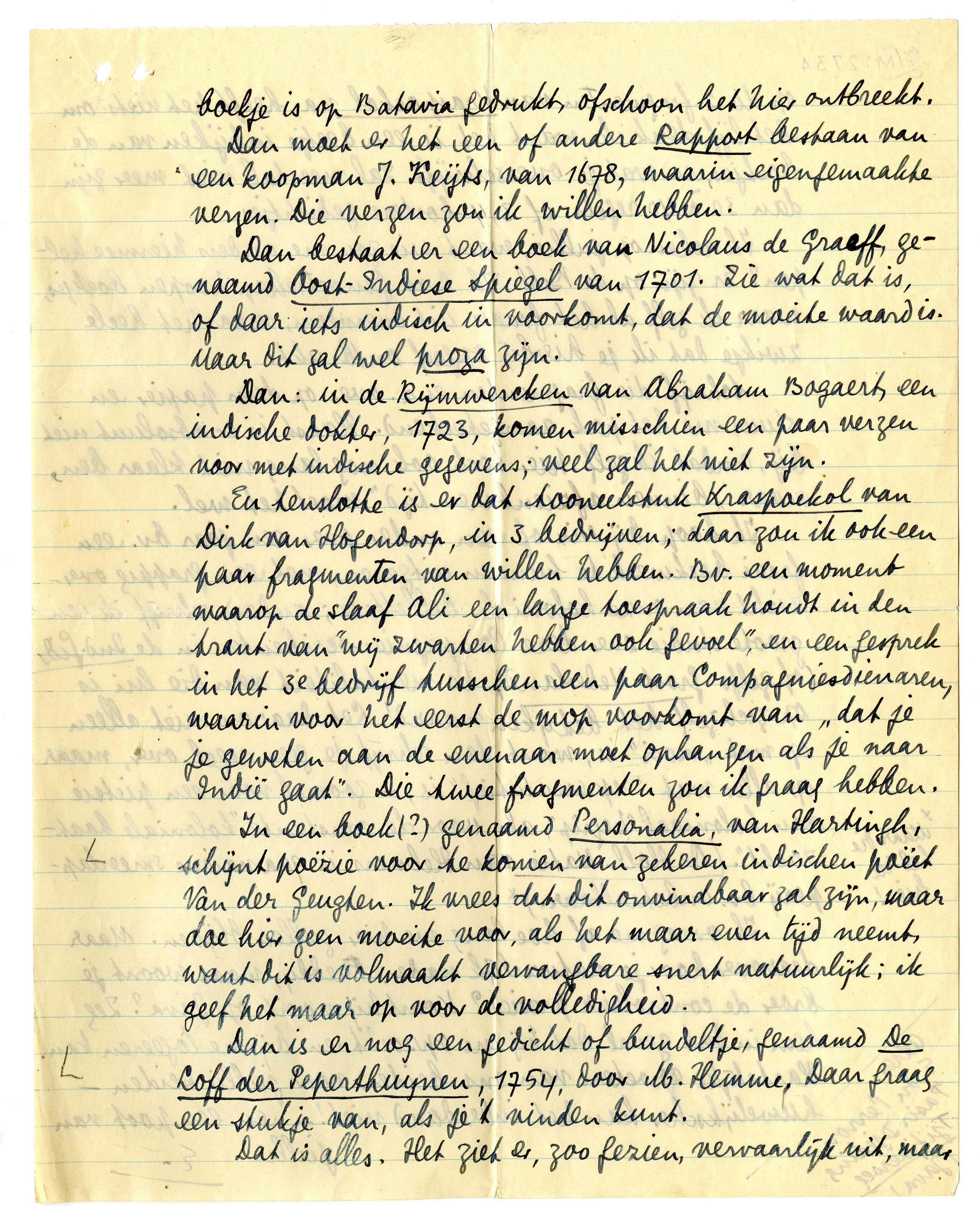 Ik reken op jullie, want wie zou me anders hiermee helpen? Er zijn op de Bibl. v/h Bat. Genootschap hoopen boekjes, waar ik zelf al het fraais uit overneem, maar het heele zwikje dat ik je hierbij opgeef ontbreekt.