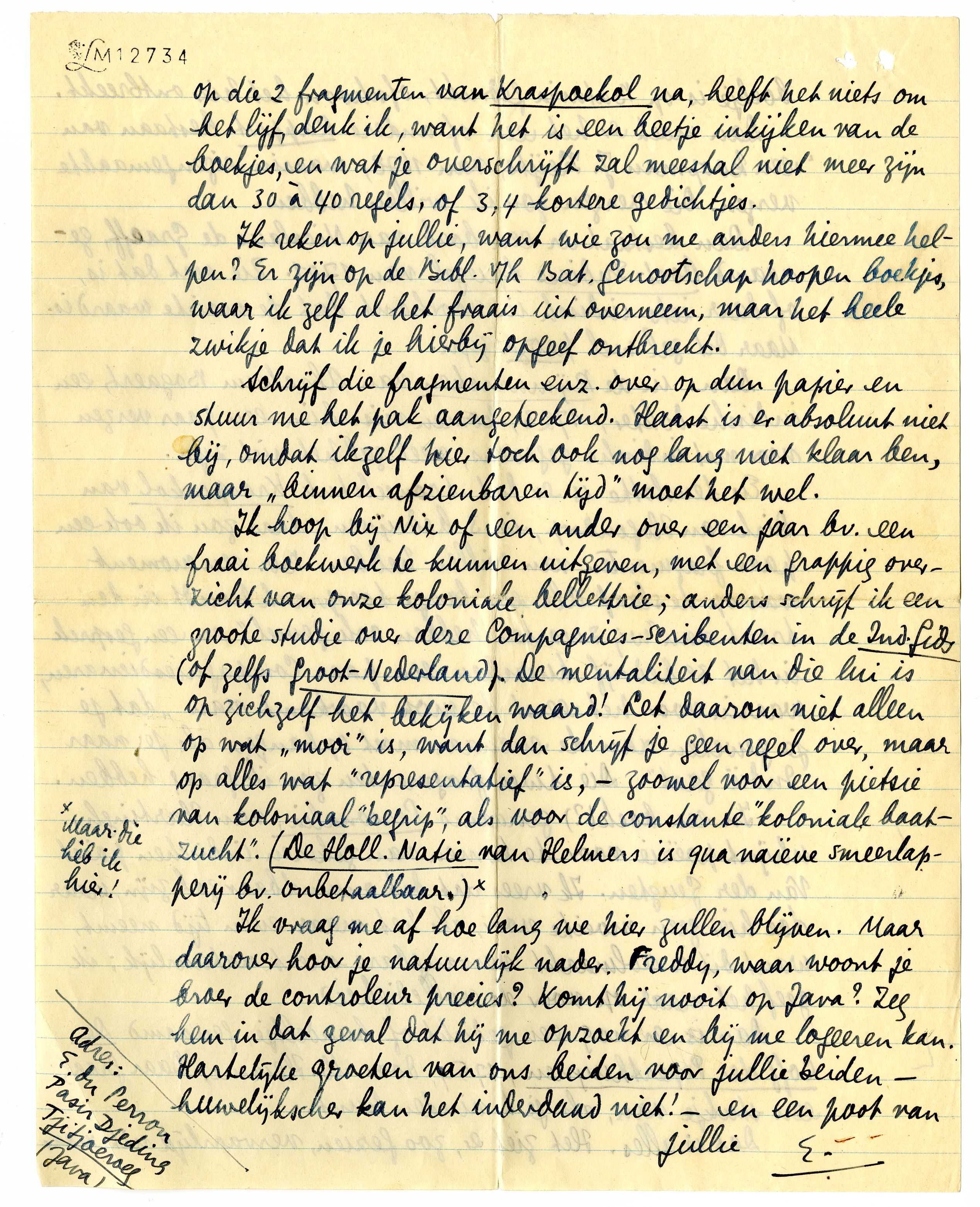 Ik hoop bij Nix of een ander over een jaar bv. een fraai boekwerk te kunnen uitgeven, met een grappig overzicht van onze koloniale bellettrie; anders schrijf ik een groote studie over deze Compagniesscribenten in de Ind. Gids (of zelfs Groot-Nederland). De mentaliteit van die lui is op zichzelf het bekijken waard! Let daarom niet alleen op wat ‘mooi’ is, want dan schrijf je geen regel over, maar op alles wat ‘representatief’ is, - zoowel voor een pietsie van koloniaal ‘begrip’, als voor de constante ‘koloniale baatzucht’. (De Holl. Natie van Helmers is qua naïeve smeerlapperij bv. onbetaalbaar.)*