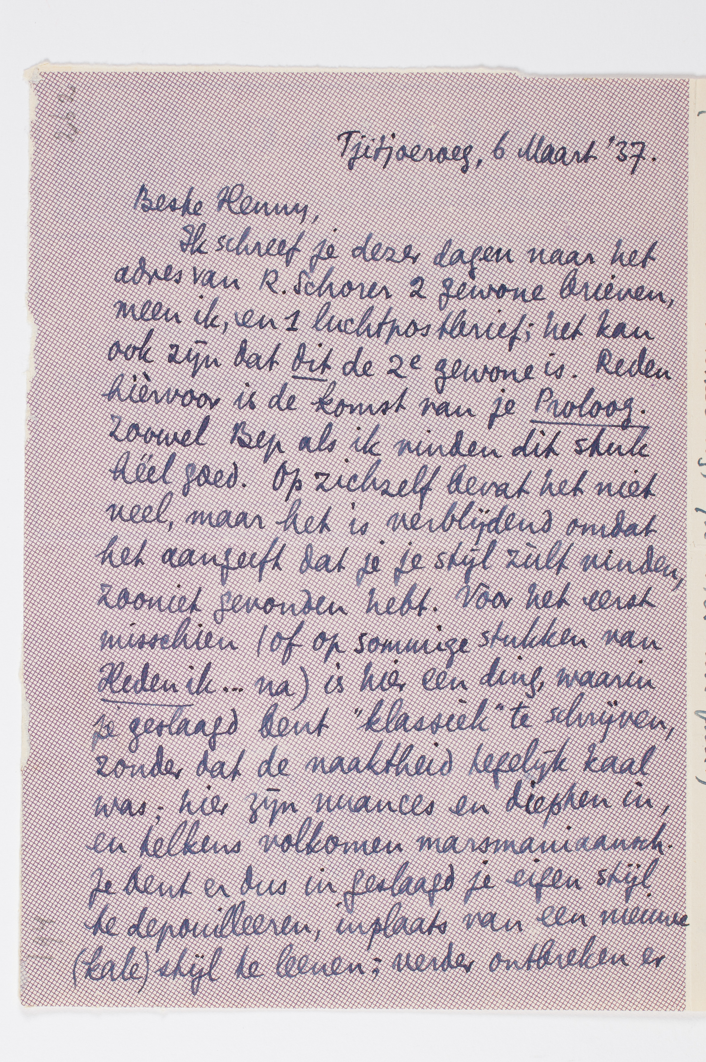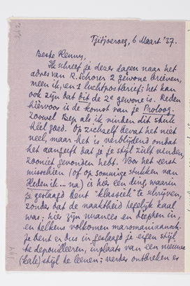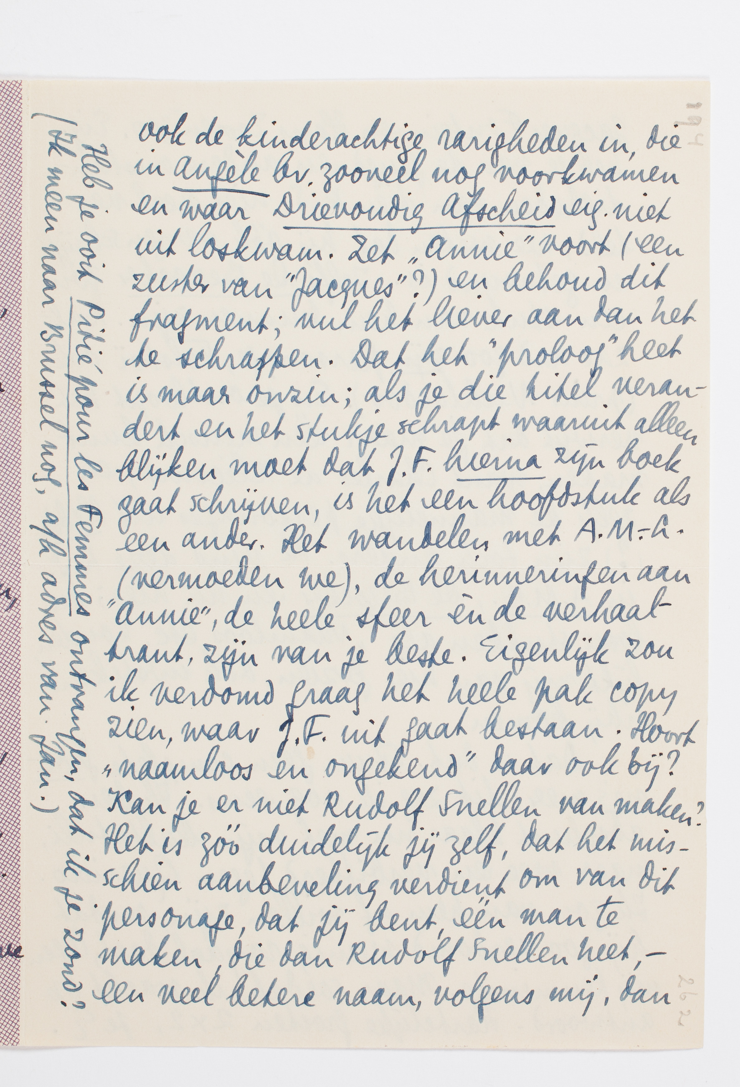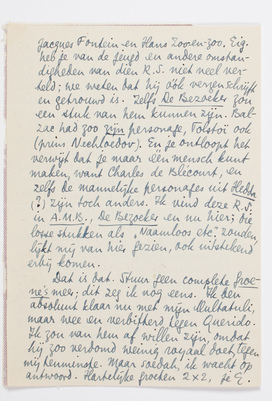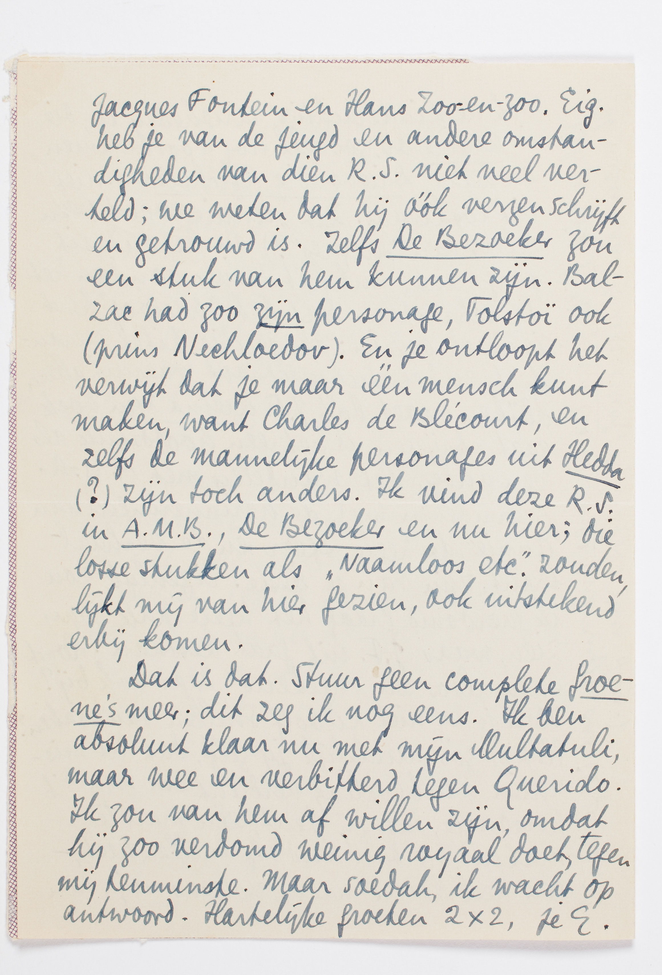 Ik schreef je dezer dagen naar het adres van R. Schorer 2 gewone brieven, meen ik, en 1 luchtpostbrief; het kan ook zijn dat dit de 2e gewone is. Reden hièrvoor is de komst van je Proloog.4513 Zoowel Bep als ik vinden dit stuk héél goed. Op zichzelf bevat het niet veel, maar het is verblijdend omdat het aangeeft dat je je stijl zùlt vinden, zooniet gevonden hebt. Voor het eerst misschien (of op sommige stukken van Heden ik... na) is hier een ding, waarin je geslaagd bent ‘klassiek’ te schrijven, zonder dat de naaktheid tegelijk kaal was; hier zijn nuances en diepten in en telkens volkomen marsmaniaansch. Je bent er dus in geslaagd je eigen stijl te depouilleeren, inplaats van een nieuwe (kale) stijl te leenen; verder ontbreken er ook de kinderachtige rarigheden in, die in Angèle bv. zooveel nog voorkwamen en waar Drievoudig Afscheid eig. niet uit loskwam. Zet ‘Annie’ voort (een zuster van ‘Jacques’?) en behoud dit fragment; vul het liever aan dan het te schrappen. Dat het ‘proloog’ heet is maar onzin; als je die titel verandert en het stukje schrapt waaruit alleen blijken moet dat J.F. hierna zijn boek gaat schrijven, is het een hoofdstuk als een ander. Het wandelen met A.M.-L. (vermoeden we), de herinneringen aan ‘Annie’, de heele sfeer èn de verhaaltrant, zijn van je beste. Eigenlijk zou ik verdomd graag het heele pak copy zien, waar J.F. uit gaat bestaan. Hoort ‘naamloos en ongekend’ daar ook bij? Kan je er niet Rudolf Snellen van maken? Het is zóóduidelijk jij zelf, dat het misschien aanbeveling verdient om van dit personage, dat jij bent, één man te maken, die dan Rudolf Snellen heet, - een veel betere naam, volgens mij, dan Jacques Fontein en Hans Zoo-en-zoo. Eig. heb je van de jeugd en andere omstandigheden van dien R.S. niet veel verteld; we weten dat hij óók verzen schrijft en getrouwd is. Zelfs De Bezoeker zou een stuk van hem kunnen zijn. Balzac had zoo zijn personage, Tolstoï ook (prins Nechloedov). En je ontloopt het verwijt dat je maar één mensch kunt maken, want Charles de Blécourt, en zelfs de mannelijke personages uit Hedda (?) zijn toch anders. Ik vind deze R.S. in A.M.B., De Bezoeker en nu hier; die losse stukken als ‘Naamloos etc.’ zouden, lijkt mij van hier gezien, ook uitstekend erbij komen.