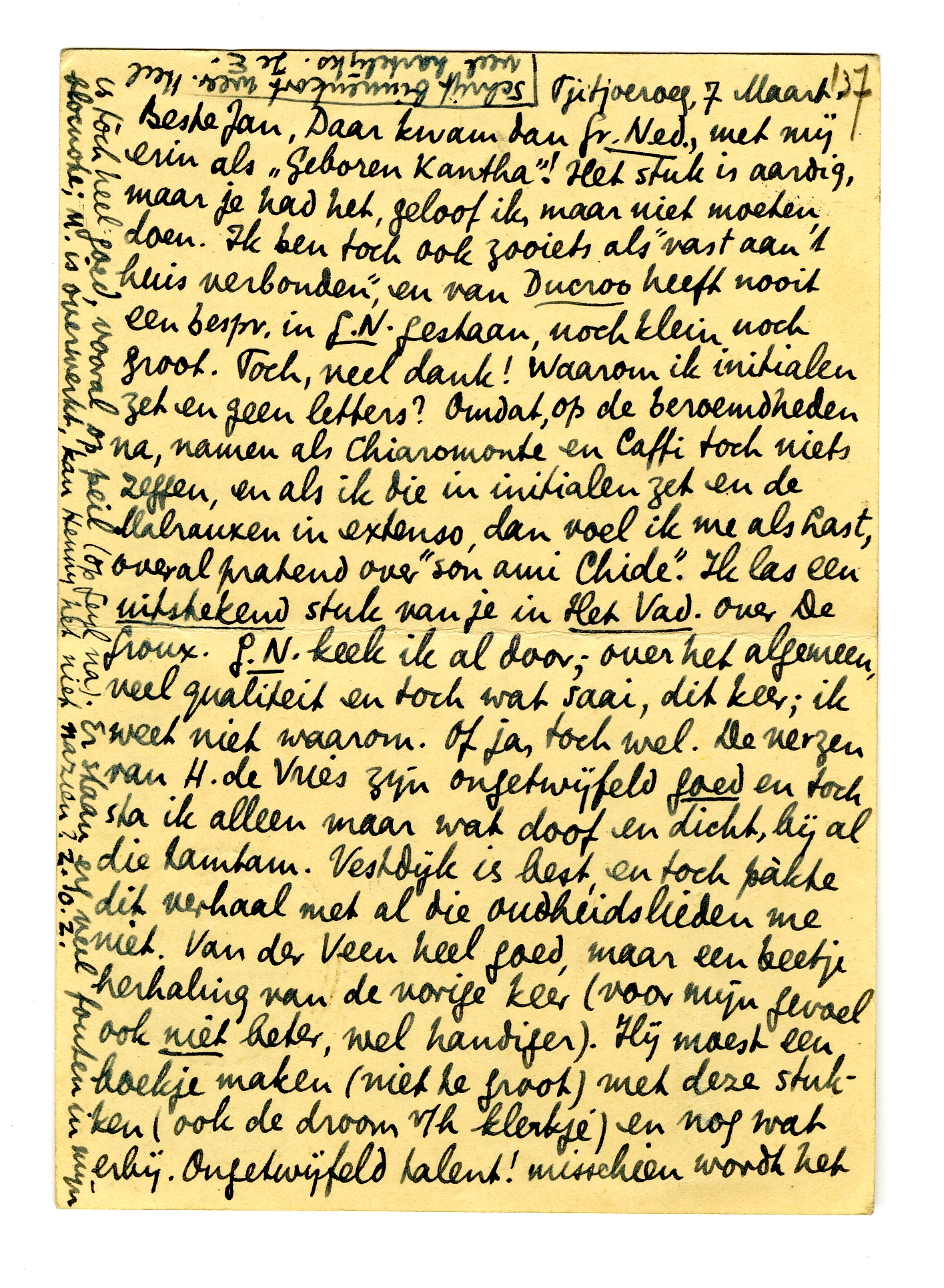 Beste Jan, Daar kwam dan Gr. Ned., met mij erin4514 als ‘Geboren Kantha’! Het stuk is aardig, maar je had het, geloof ik, maar niet moeten doen. Ik ben toch ook zooiets als ‘vast aan 't huis verbonden’, en van Ducroo heeft nooit een bespr. in G.N. gestaan, noch klein noch groot. Toch, veel dank! Waarom ik initialen zet en geen letters? Omdat, op de beroemdheden na, namen als Chiaromonte en Caffi toch niets zeggen, en als ik die in initialen zet en de Malrauxen in extenso, dan voel ik me als Last, overal pratend over ‘son ami Chide’. Ik las een uitstekend stuk van je in Het Vad. over De Groux.4515 G.N. keek ik al door; over het algemeen, veel qualiteit en toch wat saai, dit keer; ik weet niet waarom. Of ja, toch wel. De verzen van H. de Vries zijn ongetwijfeld goed en toch sta ik alleen maar wat doof en dicht, bij al die tamtam. Vestdijk is best, en toch pàkte dit verhaal met al die oudheidslieden me niet. Van der Veen heel goed, maar een beetje herhaling van de vorige keer (voor mijn gevoel ook niet beter, wel handiger). Hij moest een boekje maken (niet te groot) met deze stukken (ook de droom v/h klerkje) en nog wat erbij. Ongetwijfeld talent! misschien wordt het nog eens onze Guilloux. De poëzie van v/d Borch ook ongetw. met qualiteit, maar dééd me ook niets. En waarvoor in Godsnaam dat volslagen mediocre en stompzinnigvervelende hoofdstuk uit een literatuurgeschiedboek van heer Geyl? Onbegrijpelijk vind ik dat. Het gewoonste essay is daar een kunstwerk naast en als het nu nog maar eenig belang had! Enfin, misschien is het voor de afwisseling bedoeld. Het nr. is tòch heel goed, vooral op peil (op Geyl na). Er staan erg veel fouten in mijn blocnote; M. is overwerkt, kan Henny het niet nazien?