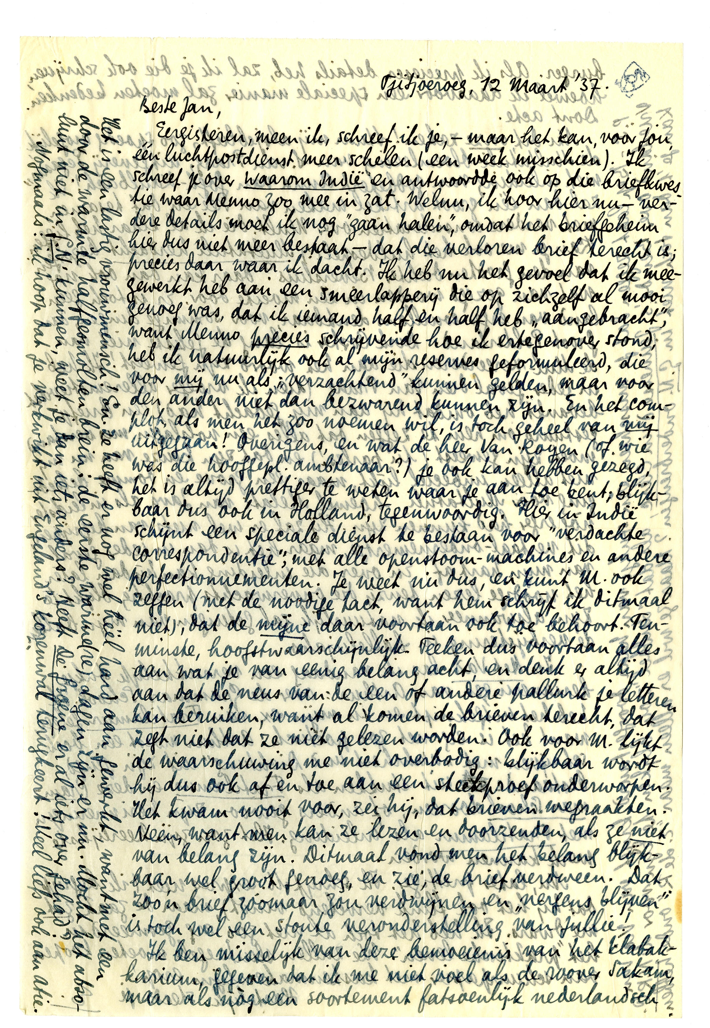 Eergisteren, meen ik, schreef ik je, - maar het kan, voor jou, één luchtpostdienst meer schelen (een week misschien). Ik schreef je over Waarom Indië en antwoordde ook op die briefkwestie waar Menno zoo mee in zat. Welnu, ik hoor hier nu - verdere details moet ik nog ‘gaan halen’, omdat het briefgeheim hier dus niet meer bestaat - dat die verloren brief terecht is; precies daar waar ik dacht. Ik heb nu het gevoel dat ik meegewerkt heb aan een smeerlapperij die op zichzelf al mooi genoeg was, dat ik iemand half en half heb ‘aangebracht’, want Menno precies schrijvende hoe ik ertegenover stond, heb ik natuurlijk ook al mijn reserves geformuleerd, die voor mij nu als ‘verzachtend’ kunnen gelden, maar voor den ander niet dan bezwarend kunnen zijn. En het complot, als men het zoo noemen wil, is toch geheel van mij uitgegaan! Overigens, en wat de heer Van Royen (of wie was die hooggepl ambtenaar?)4522 je ook kan hebben gezegd, het is altijd prettiger te weten waar je aan toe bent; blijkbaar dus ook in Holland, tegenwoordig. Hier in Indië schijnt een speciale dienst te bestaan voor ‘verdachte correspondentie’, met alle openstoom-machines en andere perfectionnementen. Je weet nu dus, en kunt M. ook zeggen (met de noodige tact, want hem schrijf ik ditmaal niet), dat de mijne daar voortaan ook toe behoort. Tenminste, hoogstwaarschijnlijk. Teeken dus voortaan alles aan wat je van eenig belang acht, en denk er altijd aan dat de neus van de een of andere pallurk je letteren kan beruiken, want al komen de brieven terecht, dat zegt niet dat ze niet gelezen worden. Ook voor M. lijkt de waarschuwing me niet overbodig: blijkbaar wordt hij dus ook af en toe aan een steekproef onderworpen. Het kwam nooit voor, zei hij, dat brieven wegraakten. Neen, want men kan ze lezen en doorzenden, als ze niet van belang zijn. Ditmaal vond men het belang blijkbaar wel groot genoeg, en zie, de brief verdween. Dat zoo'n brief zóomaar zou verdwijnen en ‘nergens blijven’ is toch wel een stoute veronderstelling van jullie!