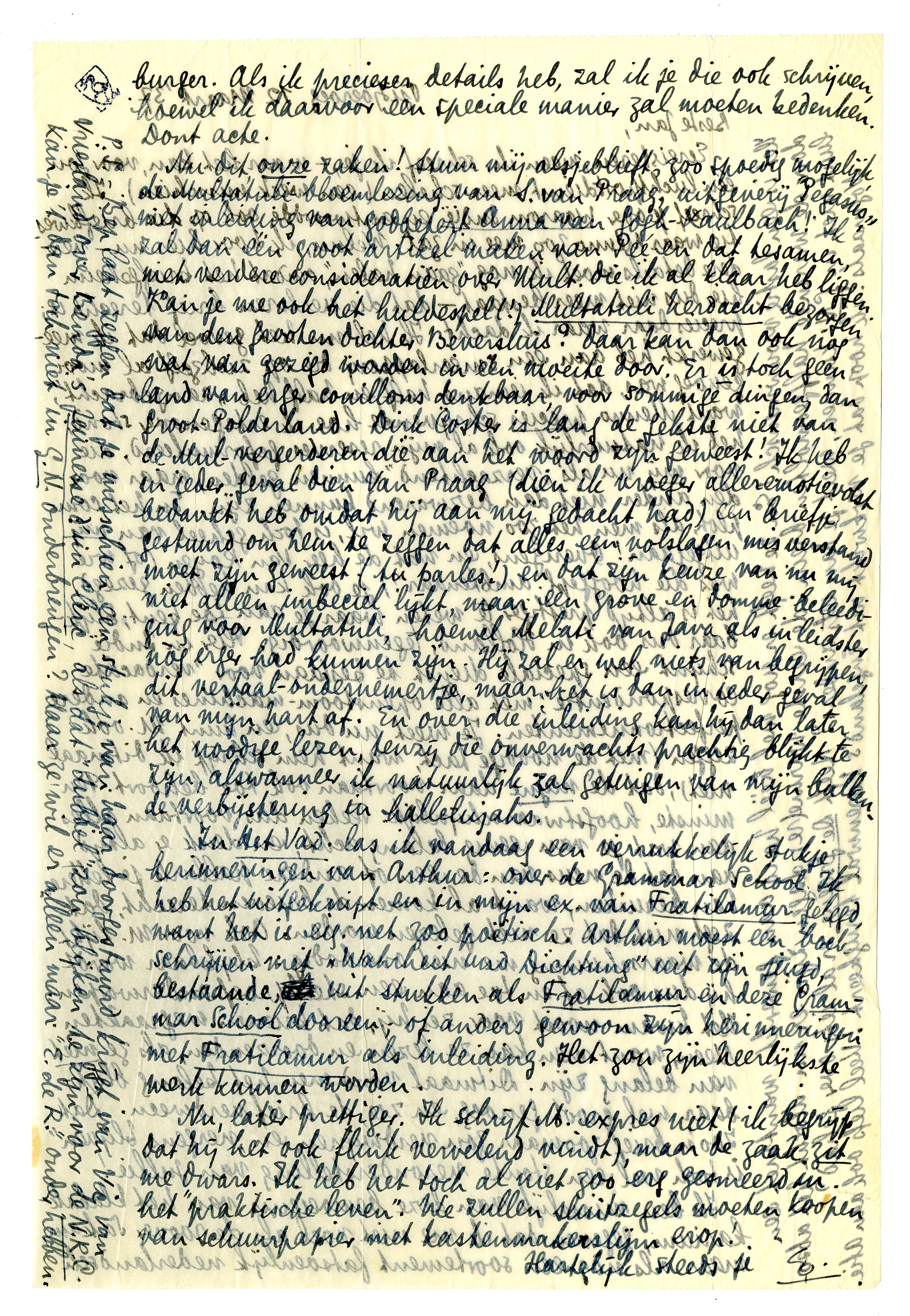 Nu dit, onze zaken! Stuur mij alsjeblief, zoo spoedig mogelijk, de Multatuli bloemlezing van S. van Praag, uitgeverij ‘Pegasus’, met inleiding van godbetert Anna van Gogh-Kaulbach!4523 Ik zal dan één groot artikel maken van Pée en dat tesamen, met verdere consideratiën over Mult die ik al klaar heb liggen. Kan je me ook het huldespel (!) Multatuli herdacht bezorgen van den grooten dichter Beversluis?4524 daar kan dan ook nog wat van gezegd worden in één moeite door. Er is toch geen land van erger couillons denkbaar, voor sommige dingen, dan Groot Polderland. Dirk Coster is lang de gekste niet van de Mul-vereerderen die aan het woord zijn geweest! Ik heb in ieder geval dien Van Praag (dien ik vroeger alleremotievolst bedankt heb omdat hij aan mij gedacht had) een briefje gestuurd4525 om hem te zeggen dat alles een volslagen misverstand moet zijn geweest (tu parles!) en dat zijn keuze van nu mij niet alleen imbeciel lijkt, maar een grove en domme beleediging voor Multatuli, hoewel Melati van Java4526 als inleidster nòg erger had kunnen zijn. Hij zal er wel niets van begrijpen, dit verhaal-ondernemertje, maar het is dan in ieder geval van mijn hart af. En over die inleiding kan hij dan later het noodige lezen, tenzij die onverwachts prachtig blijkt te zijn, als-wanneer ik natuurlijk zal getuigen van mijn balkende verbijstering in hallelujahs. In Het Vad. las ik vandaag een verrukkelijk stukje herinneringen van Arthur: over de Grammar School.4527 Ik heb het uitgeknipt en in mijn ex. van Fratilamur gelegd, want het is eig. net zoo poëtisch. Arthur moest een boek schrijven met ‘Wahrheit und Dichtung’ uit zijn jeugd, bestaande uit stukken als Fratilamur en deze Grammar School dooreen, of anders gewoon zijn herinneringen met Fratilamur als inleiding. Het zou zijn heerlijkste werk kunnen worden.