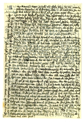 Ik zal je nu begin April f 50. sturen. Van Menno is mijn heele honorarium voor Lebak (± f 35?) naar het dépot bij Jean de St. gegaan, als aan mijn verzoek voldaan is. De opbrengst van Waarom Indië, als dat in G.N. gestaan heeft, kan ook weer naar het dépot. Verder zal ik zien; wschl. zal ik ook hier binnenkort wat verdienen (ik schreef hierover juist een lange brief aan M.,4540 dien hij je wel zenden zal). Maar ga dus vooral door met de opbrengst van Blocnote aan S. te geven, en laat Jean die bijvullen op de afgesproken manier. Er moet toch nog ièts in het ‘dépot’ zijn? Zooniet, vraag J. de S. het mij voor te schieten. Bep schrijft aan de Bank in Den Haag om J. de S. f 50 te sturen; begin, uiterlijk half April heeft hij het. Dan is voorloopig de zaak toch weer gered?