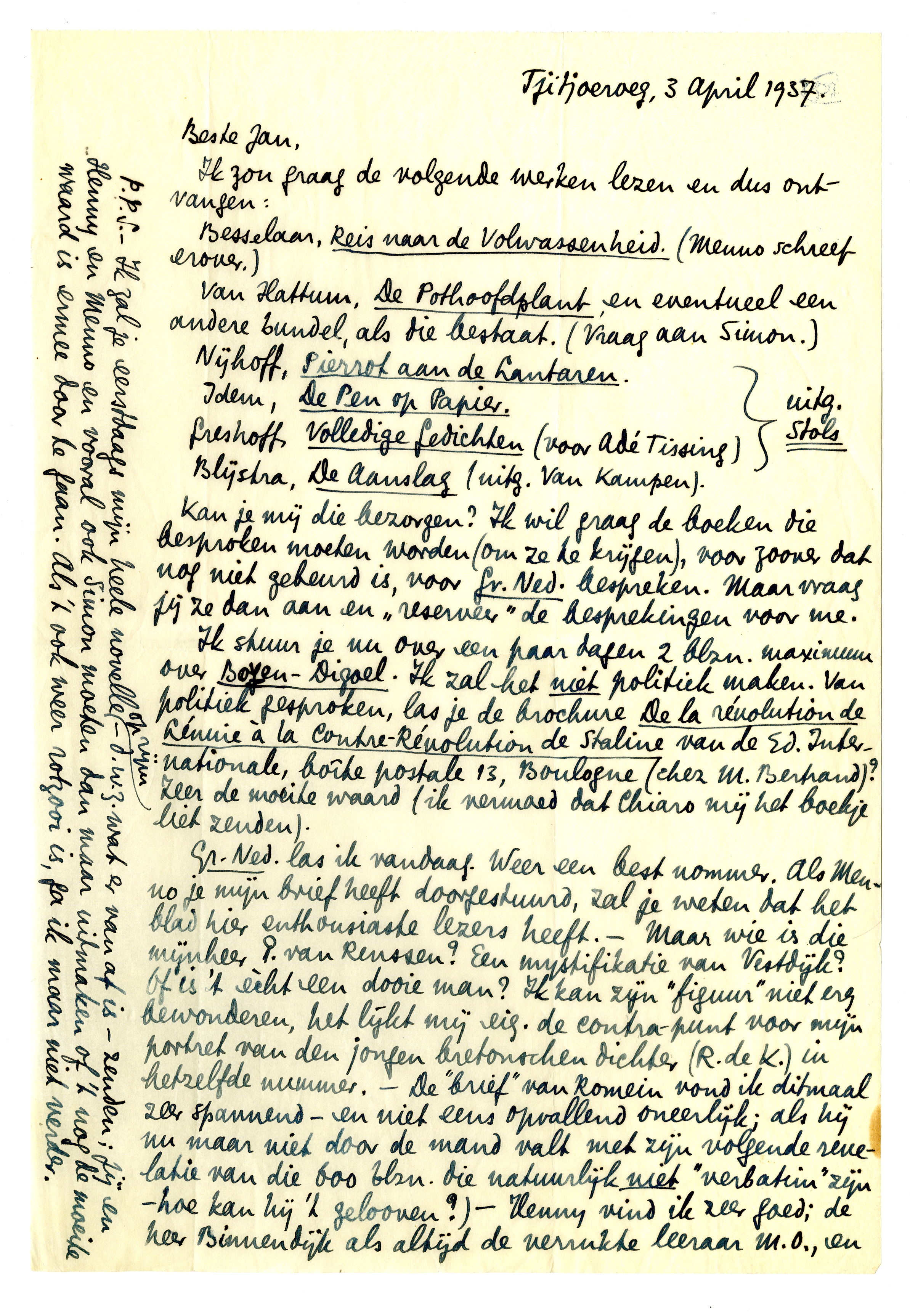 Gr. Ned,4559 las ik vandaag. Weer een best nommer. Als Menno je mijn brief heeft doorgestuurd, zal je weten dat het blad hier enthousiaste lezers heeft. - Maar wie is die mijnheer P. van Renssen? Een mystifikatie van Vestdijk? Of is 't ècht een dooie man? Ik kan zijn ‘figuur’ niet erg bewonderen, het lijkt mij eig. de contra-punt voor mijn portret van den jongen bretonschen dichter (R. de K.) in hetzelfde nummer. - De ‘brief’ van Romein vond ik ditmaal zeer spannend - en niet eens opvallend oneerlijk; als hij nu maar niet door de mand valt met zijn volgende revelatie van die 600 blzn. die natuurlijk niet ‘verbatim’ zijn - hoe kan hij 't gelooven?) - Henny vind ik zeer goed; de heer Binnendijk als altijd de verrukte leeraar M.O., en dat wat hem verrukt komt er ook altijd zoo goed bij (Brigge, Nijhoff). - Van Eyck vind ik onbeduidend maar ditmaal eerder lief dan vervelend, in die kleine leuterversjes. Eén mooie regel, zou ‘Pom’ zeggen. Welke alstublieft? Natuurlijk ‘Kwikmedit, o kwikmedit!’ - Het grafschrift van Slau prachtig. (Ik bedoel: van Slauerhoff, voor mij is hij geen ‘Slau’ meer, laat me dat niet vergeten.) - Die bespr. van Brouwer's vertaling door M. de Jong (wie is dat? ook een Saks?) is voortreffelijk en absoluut van belang, vind ik; er moest meer zulk werk geleverd worden. - Met Van Oudshoorn kan ik geen contact vinden. Ik ben ervan overtuigd dat deze novelle goed is, maar het is voor mij - bij alle verschil - een beetje hetzelfde als met Jouhandeau; het is net of alles uit een donkere kast komt, of daarin zich afspeelt, bij Jouhandeau een van binnen versierde ‘fumerie’ of zoo, bij Van Oudshoorn meer een oud buffet, met geur van schimmel maar ook nog van etensresten, zeg: oud beschuit. - Menno heb ik nog niet gelezen, maar dat zal wel goed zijn. Deze hfdstn. zijn wschl. toch pas echt goed in hun verband gelezen.