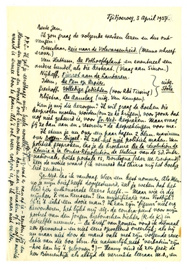 Het spijt mij dat je zoo ‘narrig’ bent. Er is reden voor, door je gedwongen werk al meer dan zat, maar vergeet ook niet dat deze tijd voor menschen als wij moordend is. Ik ben ook allesbehalve ‘in mijn bord’, quoiqu'en dise Jany. De baankwestie prikkelt en drukt me tegelijk. Ik zit ook te wachten op een soortement ‘uitkomst’. Op 't oogenblik blij weer thuis te zijn; hier is 't tenminste 's morgens en 's avonds heerlijk koel en Bep voelt zich hier ook beter. (Zij is ongeveer ziek van Proempang weggegaan.) Ik hoop binnenkort eens een brief van je te krijgen, desnoods één litanie van klachten, want telkens weer een briefkaart is toch niet je dat.