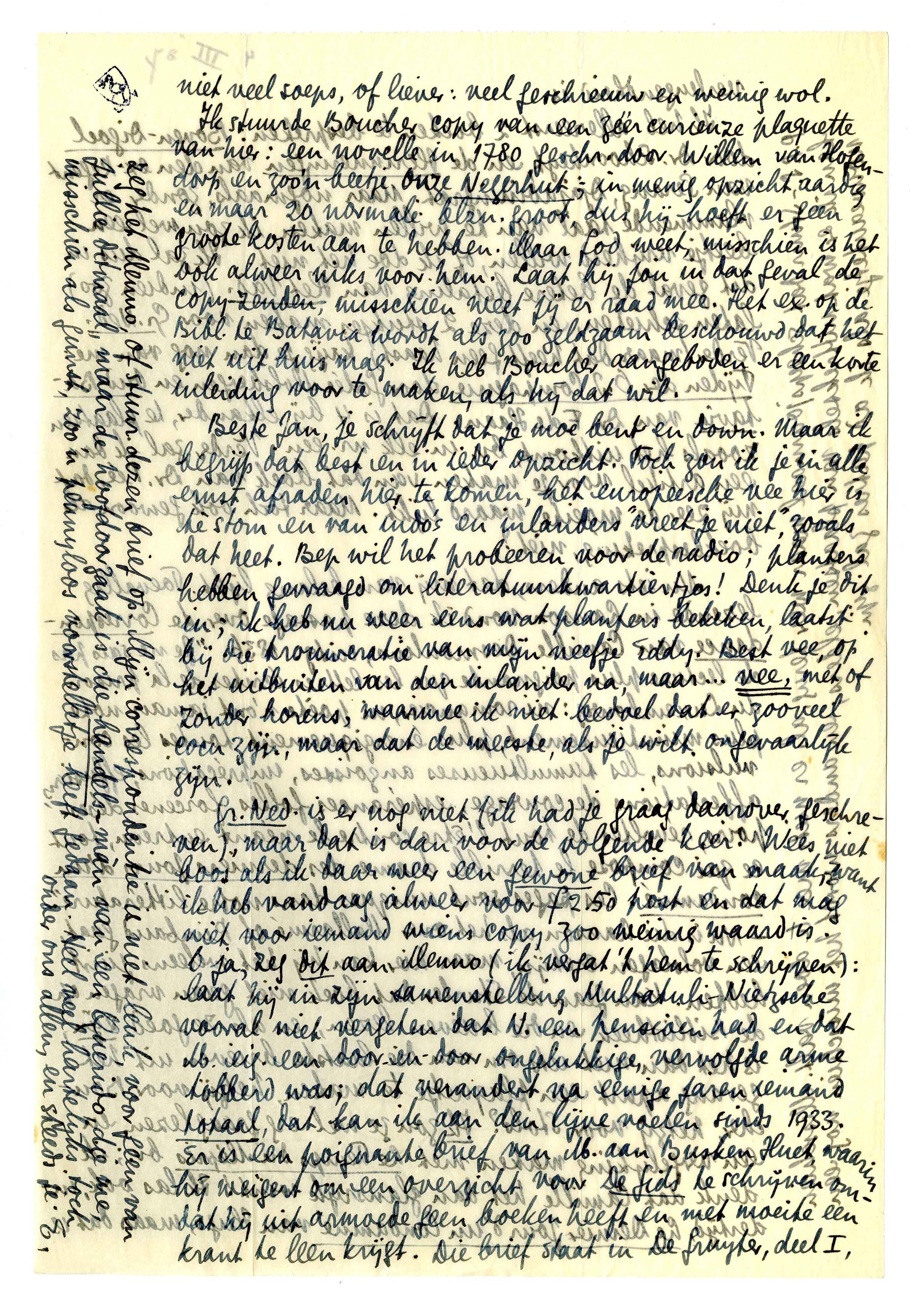 P.S. - Hoe Menno je schrijven kon dat Kolff mijn Mult. uitgaf, begrijp ik niet. Ik schreef hem dat ik daar wel kans maakte. Maar nu is de zaak met Q. in orde, zooals je weet. Tenzij ik opeens nog een prachtaanbod erop krijg - en Q. er dan nog van af wil.