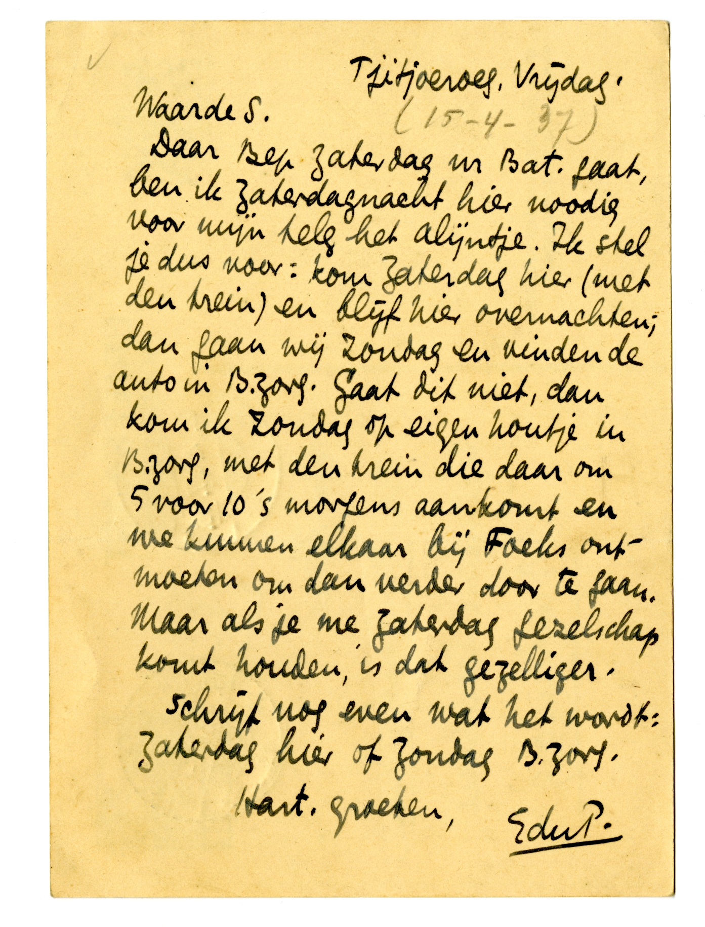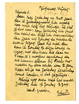Daar Bep Zaterdag nr. Bat. gaat, ben ik Zaterdagnacht hier noodig voor mijn telg het Alijntje. Ik stel je dus voor: kom Zaterdag hier (met den trein) en blijf hier overnachten; dan gaan wij Zondag en vinden de auto in B. zorg. Gaat dit niet, dan kom ik Zondag op eigen houtje in B. zorg, met den trein die daar om 5 voor 10 's morgens aankomt en we kunnen elkaar bij Foeks4595 ontmoeten om dan verder door te gaan. Maar als je me Zaterdag gezelschap komt houden, is dat gezelliger.