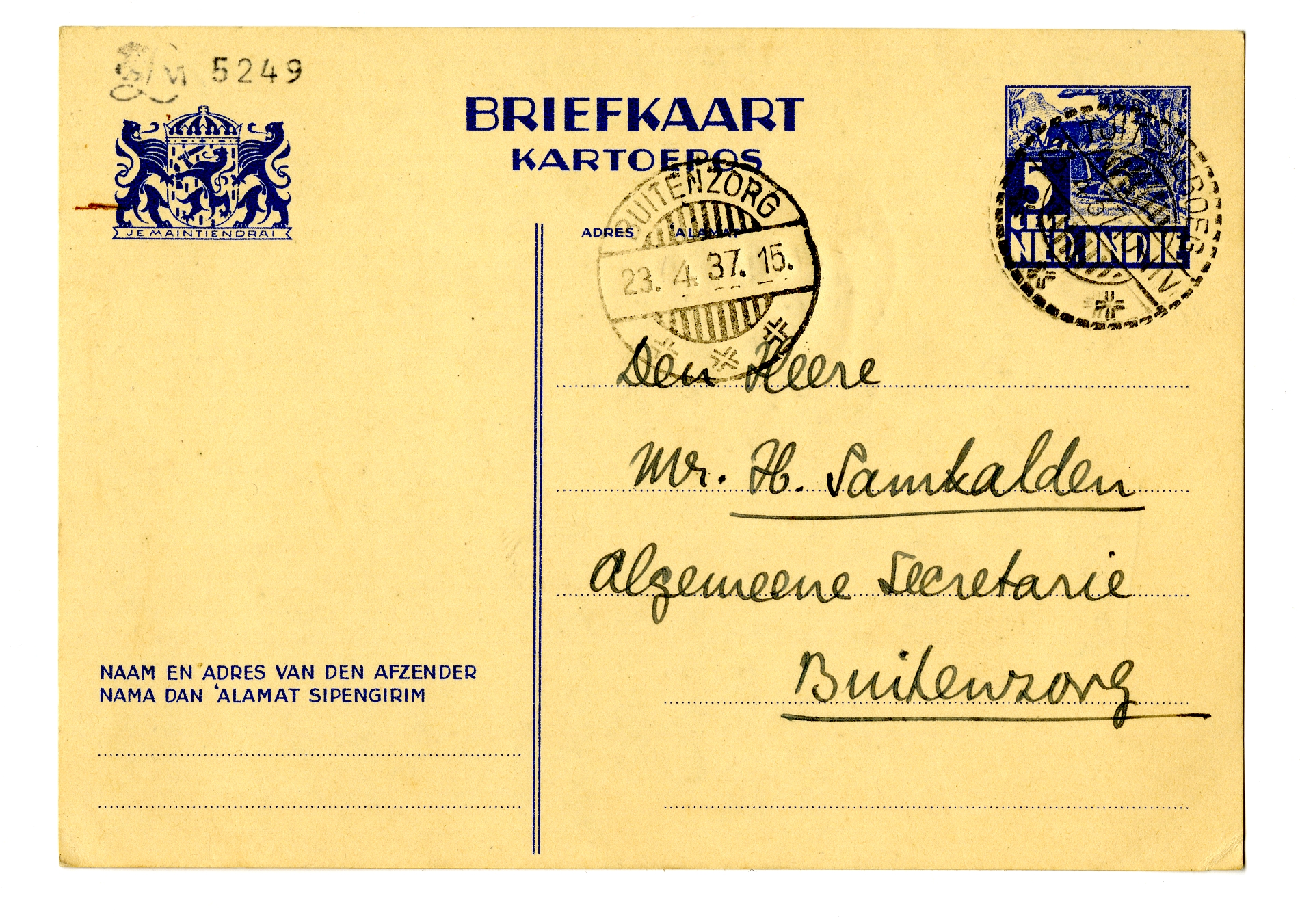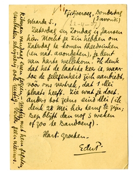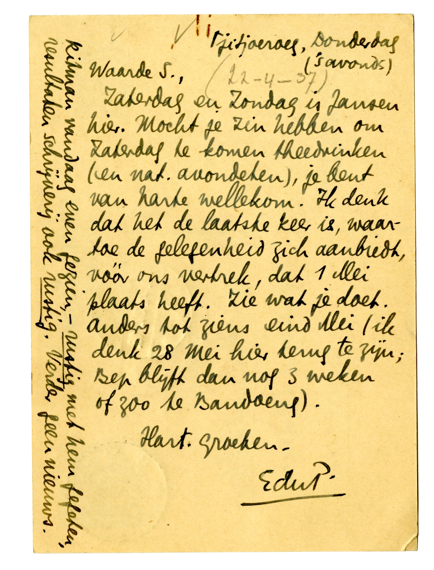 Zaterdag en Zondag is Jansen hier. Mocht je zin hebben om Zaterdag te komen theedrinken (en nat. avondeten), je bent van harte wellekom. Ik denk dat het de laatste keer is, waartoe de gelegenheid zich aanbiedt, vóór ons vertrek, dat 1 Mei plaats heeft. Zie wat je doet. Anders tot ziens eind Mei (ik denk 28 Mei hier terug te zijn; Bep blijft dan nog 3 weken of zoo te Bandoeng).