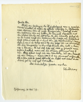 Hierbij een teekening die ik inderhaast voor u maakte. Meestal krabbel ik alleen op allerlei vloeitjes en kladpapier, maar daarvan kan ik niets terugvinden. Greshoff moet een teekening van mij hebben die hemzelf voorstelt, met een schotsch hondje van porselijn op den schouder, geloof ik4656; en Ter Braak heeft een teekening die vroeger als titelplaat heeft gediend voor de 1e druk van Een Voorbereiding (weinig bekend, want de oplage werd op een paar exx. na vernie-tigd). Als deze ‘compositie’ u dus niet bevalt, dan hebt u daar nog 2 kansen. Ik heb ook hier nog voor u gezocht naar oudere krabbels, maar ook die schijnen allemaal weg te zijn. Deze plaat heeft iets van Beardsley, iets van Rossetti, iets van Cocteau - maar zoo is-ie nu eenmaal uitgevallen. Als u hem niet te groot afdrukt, en liefst met zetsel encadreert, zal hij nog wel meevallen.