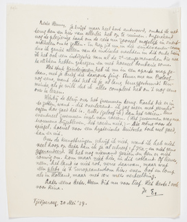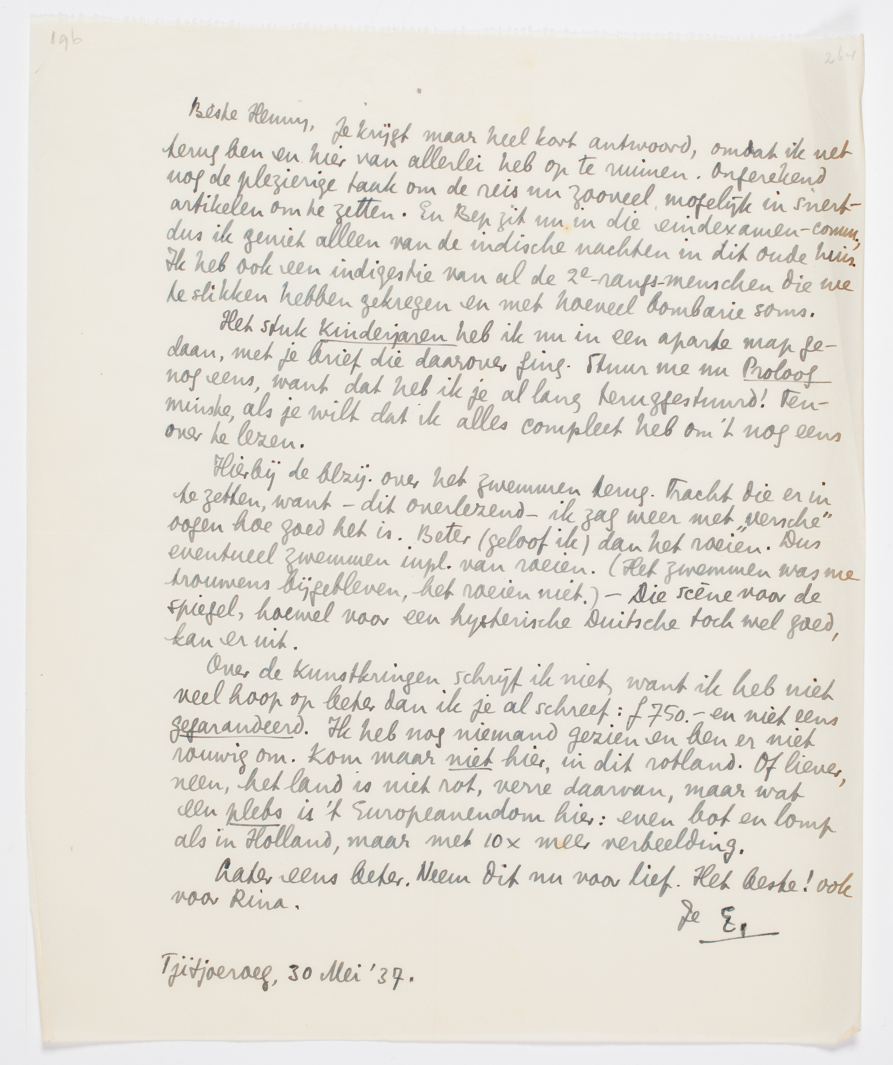Beste Henny, Je krijgt maar heel kort antwoord, omdat ik net terug ben en hier van allerlei heb op te ruimen. Ongerekend nog de plezierige taak om de reis nu zooveel mogelijk in snertartikelen om te zetten. En Bep zit nu in die eindexamen-comm., dus ik geniet alleen van de indische nachten in dit oude huis. Ik heb ook een indigestie van al de 2e-rangs-menschen die we te slikken hebben gekregen en met hoeveel bombarie soms.