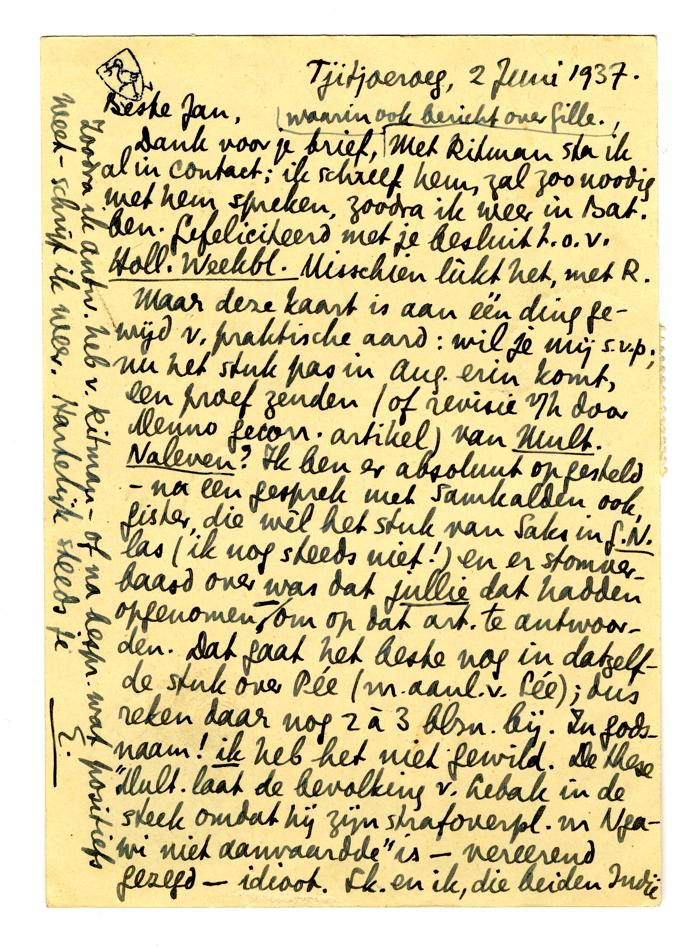 Dank voor je brief, waarin ook bericht over Gille. Met Ritman sta ik al in contact; ik schreef hem, zal zoo noodig met hem spreken, zoodra ik weer in Bat. ben. Gefeliciteerd met je besluit t.o.v. Holl. Weekbl. Misschien lùkt het, met R.4666