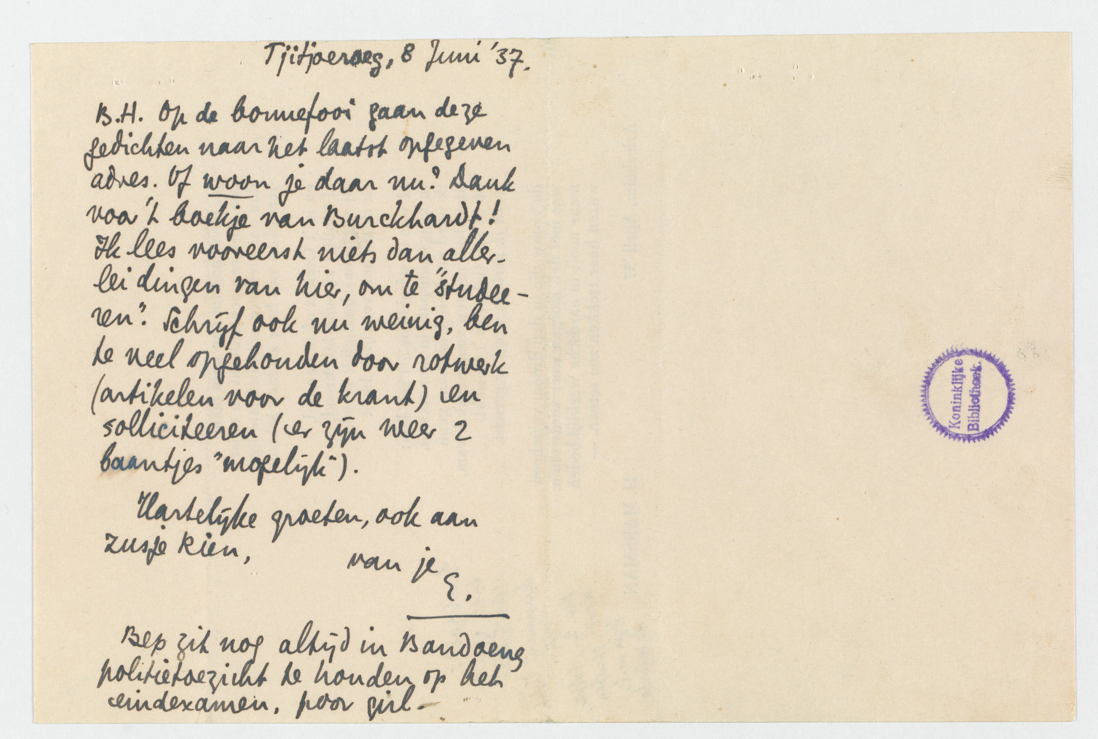 B.H. Op de bonnefooi gaan deze gedichten4696 naar het laatst opgegeven adres. Of woon je daar nu? Dank voor 't boekje van Burckhardt!