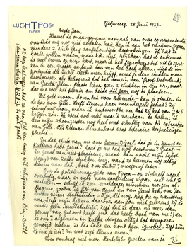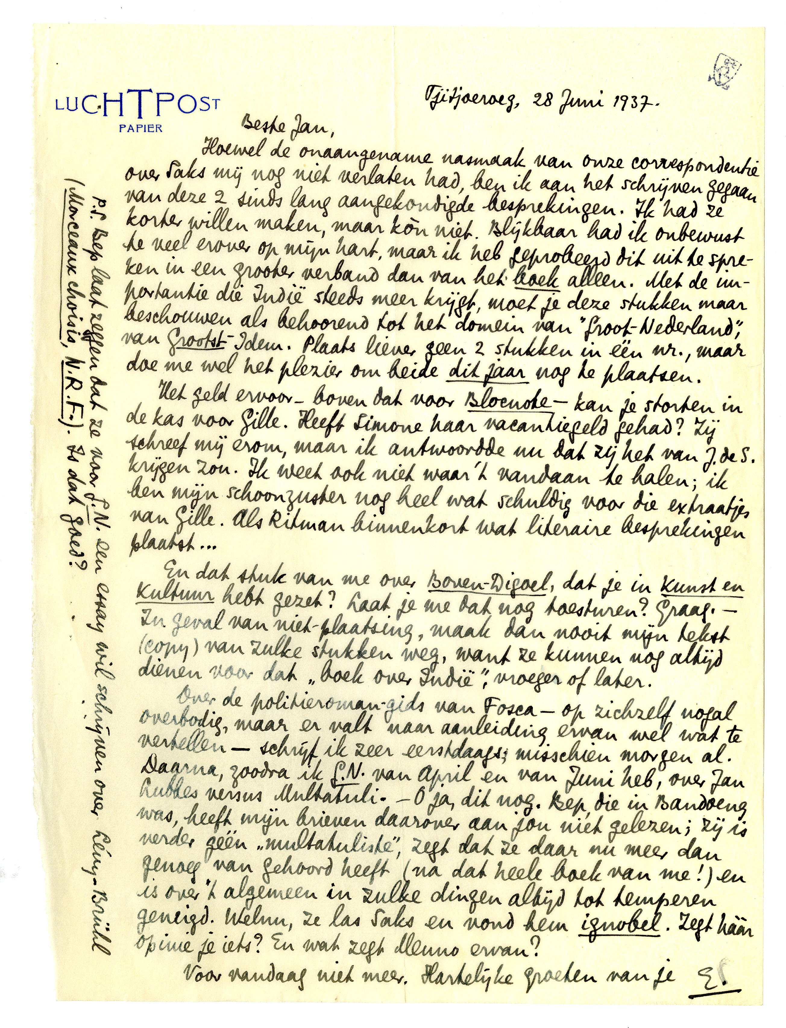 Over de politieroman-gids van Fosca - op zichzelf nogal overbodig, maar er valt naar aanleiding ervan wel wat te vertellen - schrijf ik zeer eerstdaags; misschien morgen al. Daarna, zoodra ik G.N. van April en van Juni heb, over Jan Lubbes versus Multatuli. - O ja, dit nog. Bep, die in Bandoeng was, heeft mijn brieven daarover aan jou niet gelezen; zij is verder géén ‘multatuliste’, zegt dat ze daar nu meer dan genoeg van gehoord heeft (na dat heele boek van me!) en is over 't algemeen in zulke dingen altijd tot temperen geneigd. Welnu, ze las Saks en vond hem ignobel. Zegt hààr opinie je iets? En wat zegt Menno ervan?