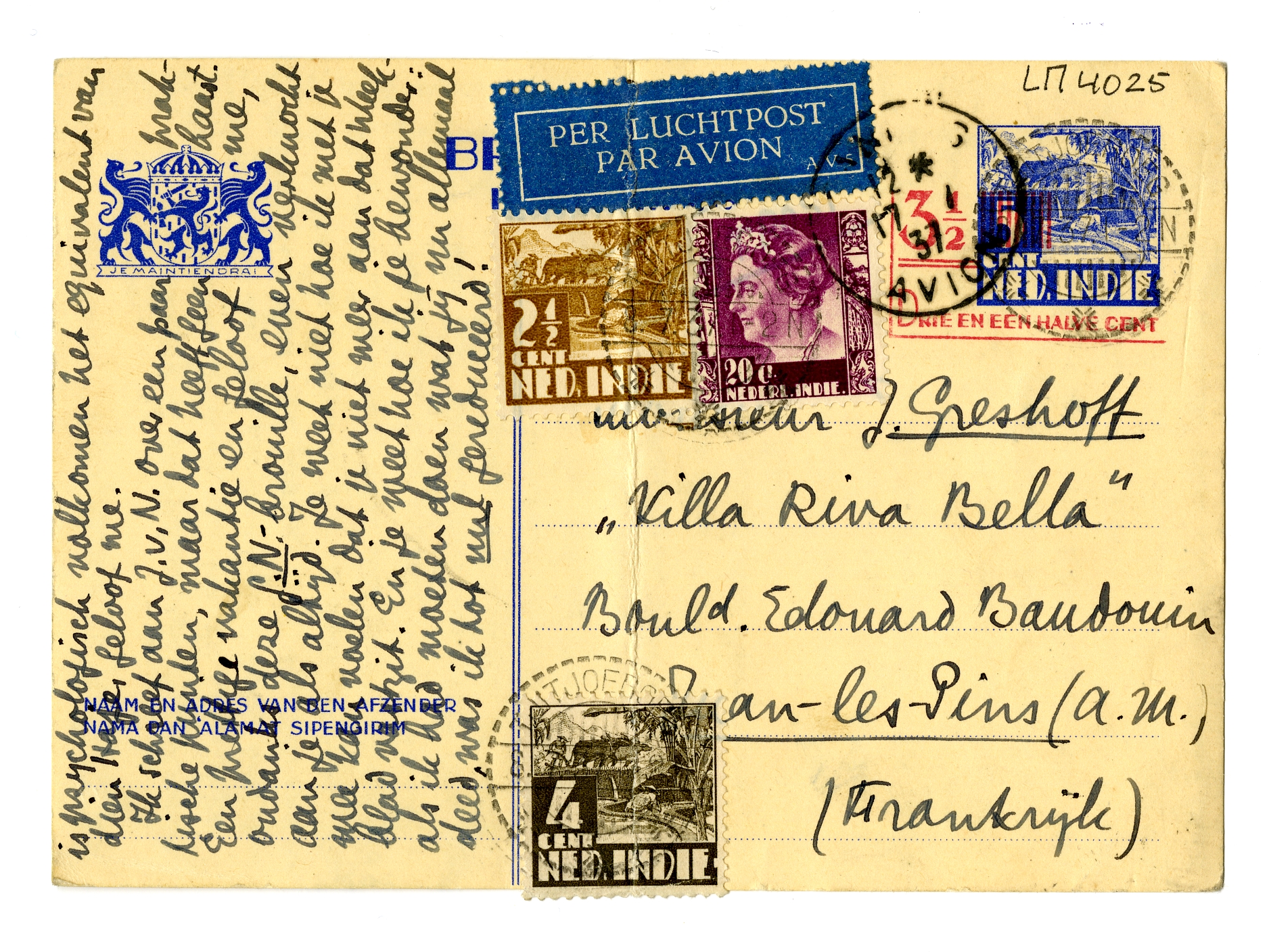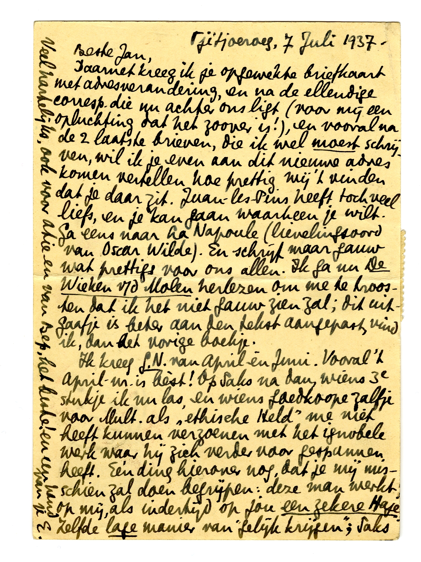 Daarnet kreeg ik je opgewekte briefkaart met adresverandering, en na de ellendige corresp. die nu achter ons ligt (voor mij een opluchting dat het zoover is!), en vooral na de 2 laatste brieven, die ik wel moest schrijven, wil ik je even aan dit nieuwe adres komen vertellen hoe prettig wij 't vinden dat je daar zit. Juan-les-Pins heeft toch veel liefs, en je kan gaan waarheen je wilt. Ga eens naar La Napoule (lievelingsoord van Oscar Wilde). En schrijf maar gauw wat prettigs voor ons allen. Ik ga nu De Wieken v/d Molen4733 herlezen om me te troosten dat ik het niet gauw zien zal; dit uitgaafje is beter aan den tekst aangepast, vind ik, dan het vorige boekje.
