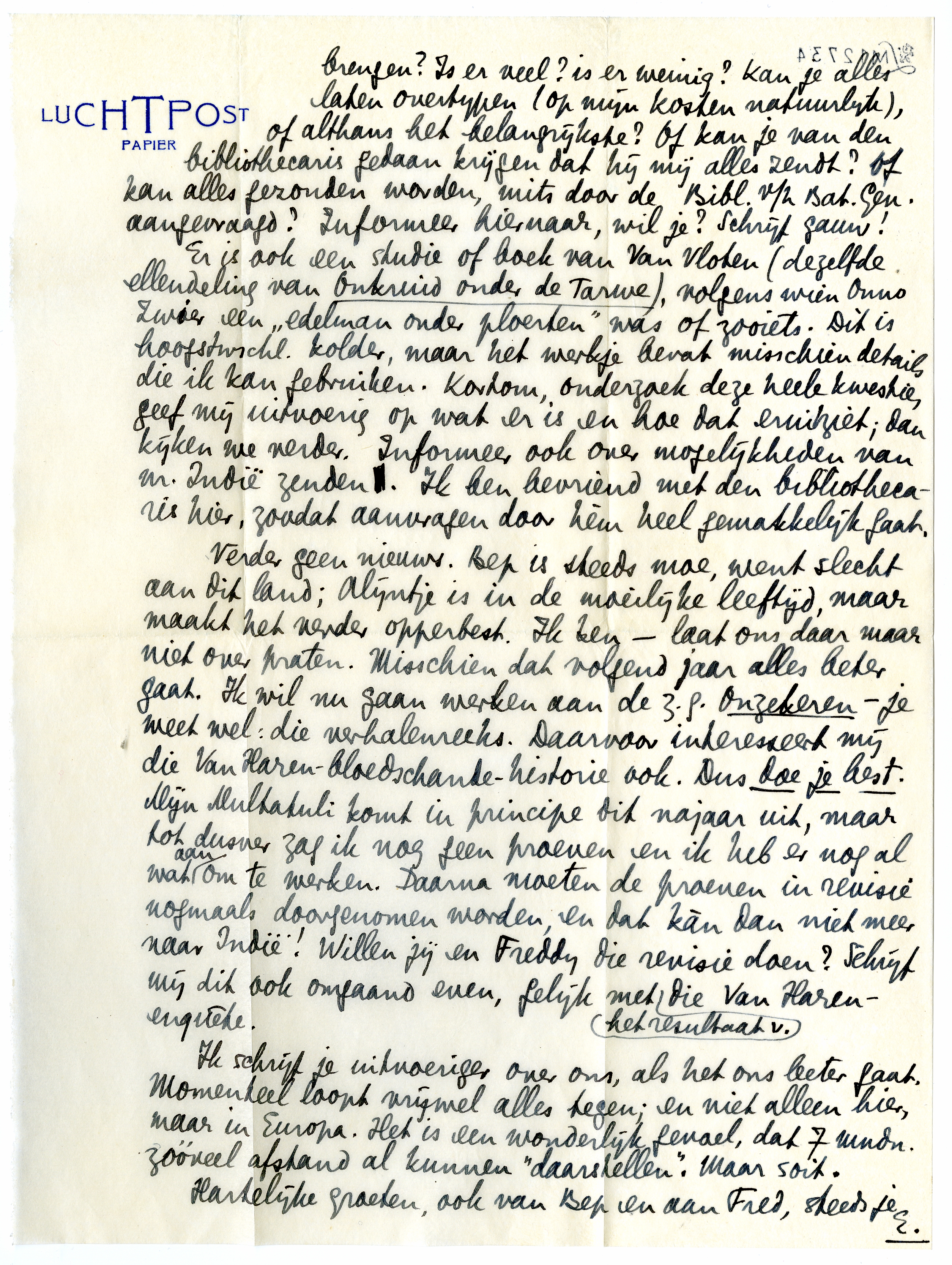 Ik wil er misschien een verhaal van maken4740 en zou daarom die Deductiën, en de Replieken of zoo erop, willen lezen. Maar nu is de vraag: hoe kom ik eraan? Hier in de Bibl. v/h Bat. Genootschap zijn ze niet. Ik kom dus weer bij jou om hulp. Wil je die boel opzoeken - zoo compleet mogelijk - en er mij verslag van uitbrengen? Is er veel? is er weinig? Kan je alles laten overtypen (op mijn kosten natuurlijk), of althans het belangrijkste? Of kan je van den bibliothecaris gedaan krijgen dat hij mij alles zendt? Of kan alles gezonden worden, mits door de Bibl. v/h Bat. Gen. aangevraagd? Informeer hiernaar, wil je? Schrijf gauw!