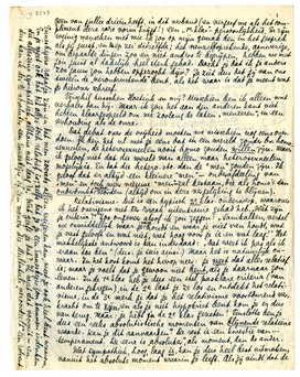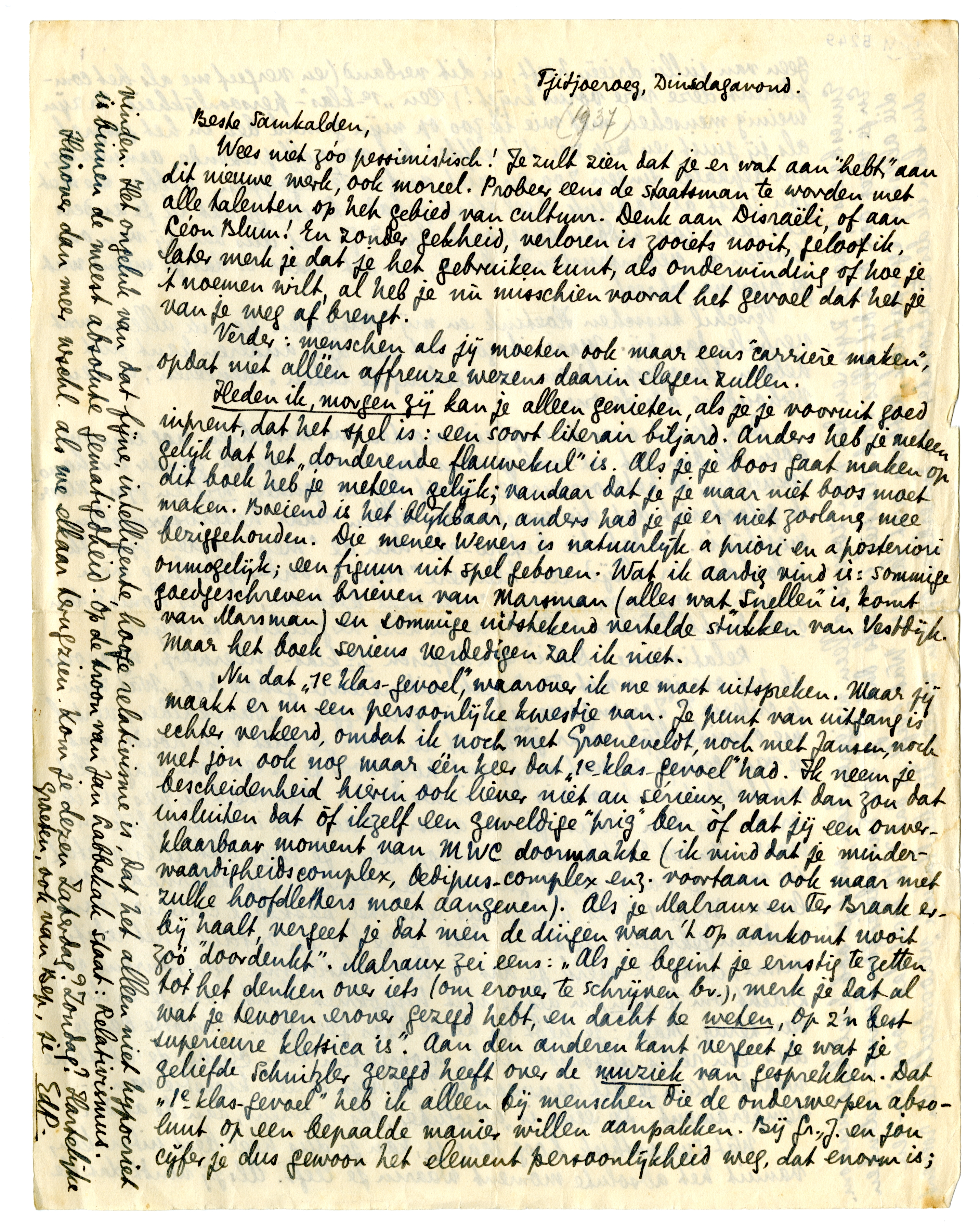 Nu dat ‘1e klas-gevoel,’ waarover ik me moet uitspreken. Maar jij maakt er nu een persoonlijke kwestie van. Je punt van uitgang is echter verkeerd, omdat ik noch met Groeneveldt, noch met Jansen, noch met jou ook nog maar één keer dat ‘1e klas-gevoel’ had. Ik neem je bescheidenheid hierin ook liever niet au sérieux, want dan zou dat insluiten dat òf ikzelf een geweldige ‘prig’ ben òf dat jij een onverklaarbaar moment van MWC doormaakte (ik vind dat je minderwaardigheidscomplex, Oedipus-complex enz. voortaan ook maar met zulke hoofdletters moet aangeven). Als je Malraux en Ter Braak er bij haalt, vergeet je dat men de dingen waar 't op aankomt nooit zoo ‘doordenkt’. Malraux zei eens: ‘Als je begint je ernstig te zetten tot het denken over iets (om erover te schrijven bv.), merk je dat al wat je tevoren erover gezegd hebt, en dacht te weten, op z'n best superieure kletsica is’. Aan den anderen kant vergeet je wat je geliefde Schnitzler gezegd heeft over de muziek van gesprekken. Dat ‘1e-klas-gevoel’ heb ik alleen bij menschen die de onderwerpen absoluut op een bepaalde manier willen aanpakken. Bij Gr., J. en jou cijfer je dus gewoon het element persoonlijkheid weg, dat enorm is; geen van jullie drieën heeft, in dit verband (en vergeef me als het compliment deze rare vorm krijgt!) een ‘1e-klas’-persoonlijkheid. Er zijn weinig menschen met wie ik zoo op mijn gemak ben in het gesprek als jij juist, en Bep zei ditzelfde; het vanzelfsprekende, aanwezige, om bepaalde dingen zoo en niet anders te begrijpen, hebben we met jou juist al dadelijk heel sterk gehad. Dacht je dat ik je anders zoo gauw zou hebben opgezocht bijv? Je ziet dus dat jij van ons tweeën de ‘verontrustende’ bent, als het waar is dat je meent wat je hierover schreef.