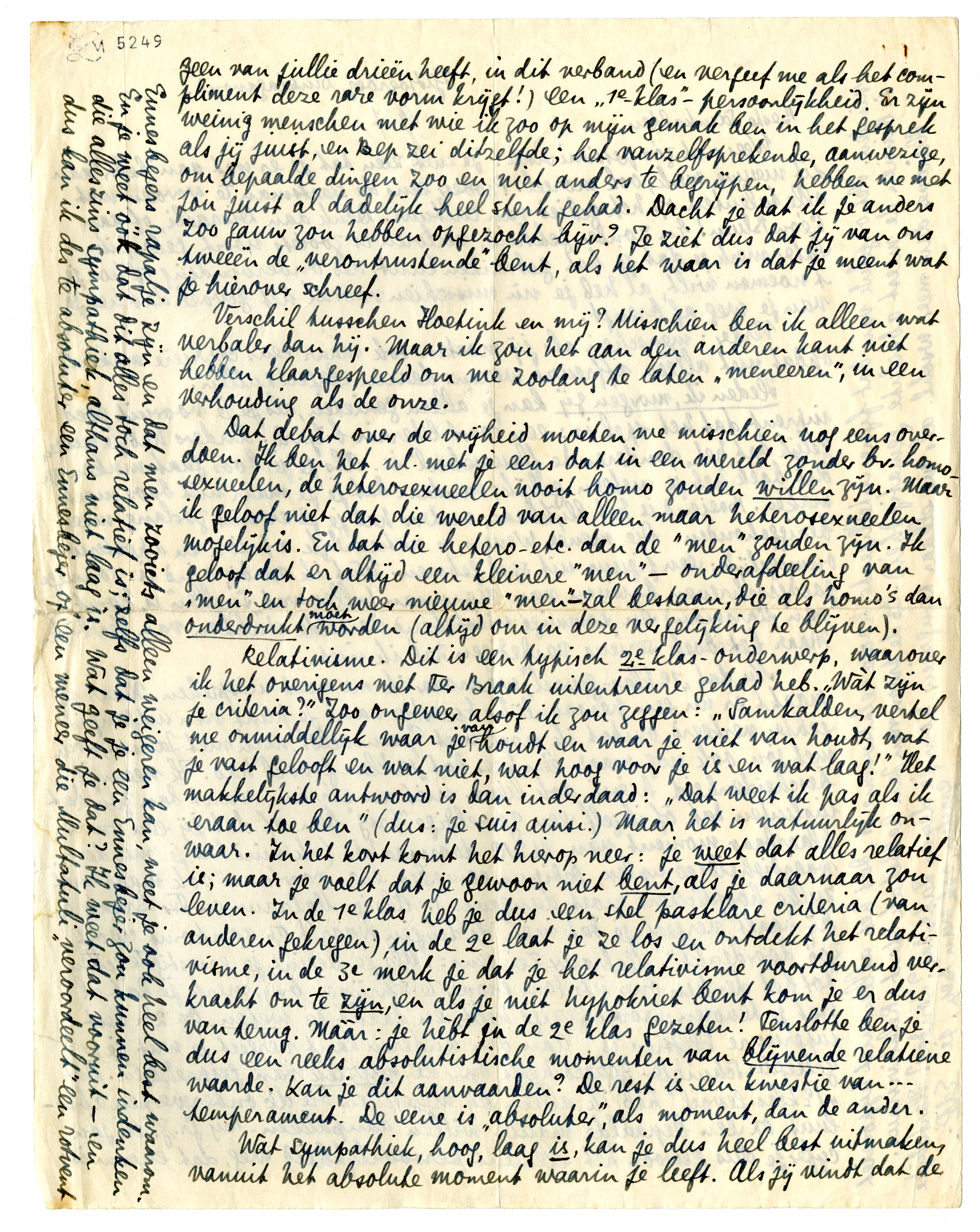 Relativisme. Dit is een typisch 2e-klas-onderwerp, waarover ik het overigens met Ter Braak uitentreure gehad heb. ‘Wàt zijn je criteria?’ Zoo ongeveer alsof ik zou zeggen: ‘Samkalden, vertel me onmiddellijk waar je van houdt en waar je niet van houdt, wat je vast gelooft en wat niet, wat hoog voor je is en wat laag!’ Het makkelijkste antwoord is dan inderdaad: ‘Dat weet ik pas als ik eraan toe ben’ (dus: je suis ainsi.). Maar het is natuurlijk onwaar. In het kort komt het hierop neer: je weet dat alles relatief is; maar je voelt dat je gewoon niet bent, als je daarnaar zou leven. In de 1e klas heb je dus een stel pasklare criteria (van anderen gekregen), in de 2e laat je ze los en ontdekt het relativisme, in de 3e merk je dat je het relativisme voortdurend verkracht om te zijn, en als je niet hypokriet bent komt je er dus van terug. Mààr: je hèbt in de 2e klas gezeten! Tenslotte ben je dus een reeks absolutistische momenten van blijvende relatieve waarde. Kan je dit aanvaarden? De rest is een kwestie van... temperament. De eene is ‘absoluter’, als moment, dan de ander.
