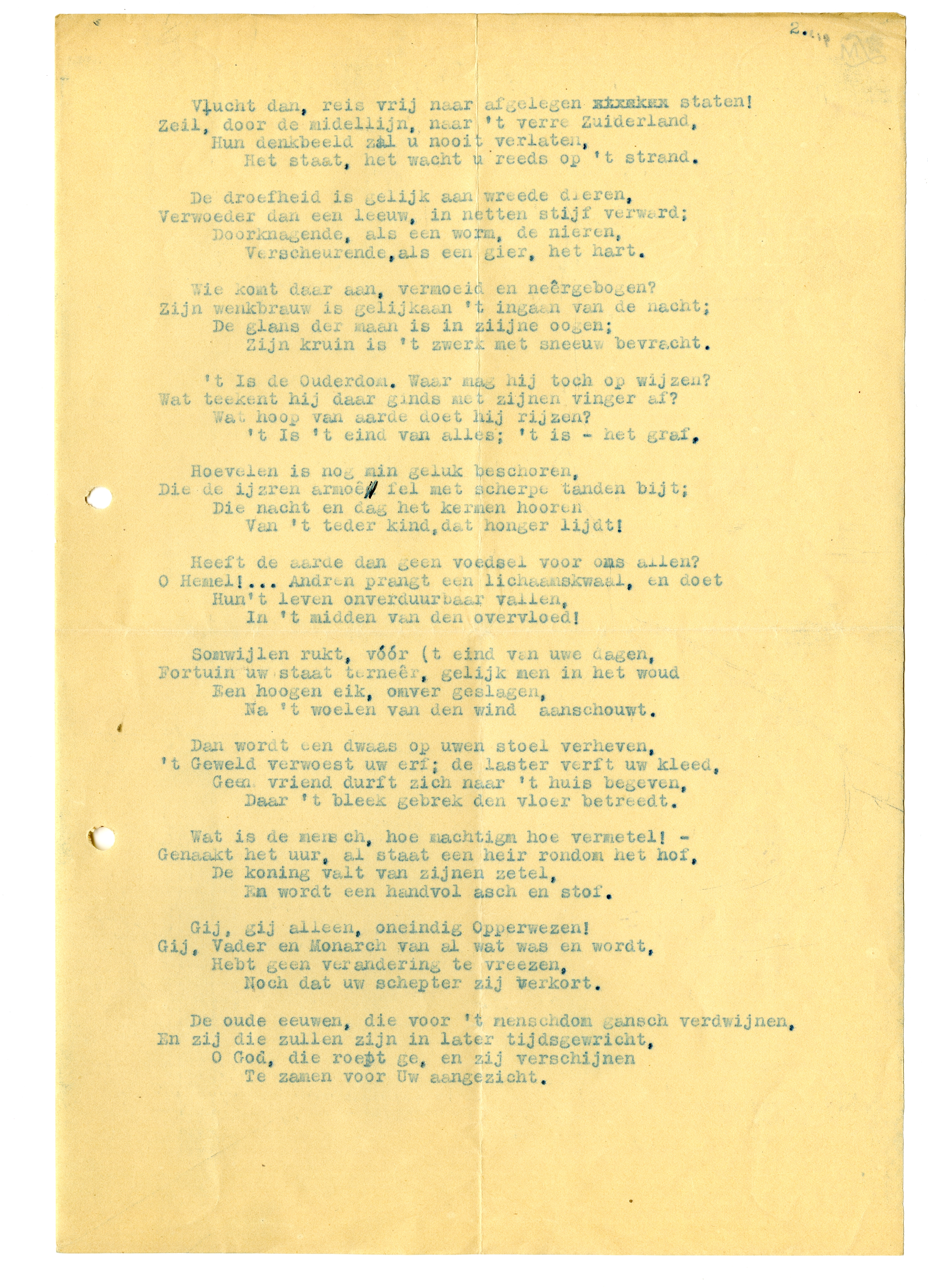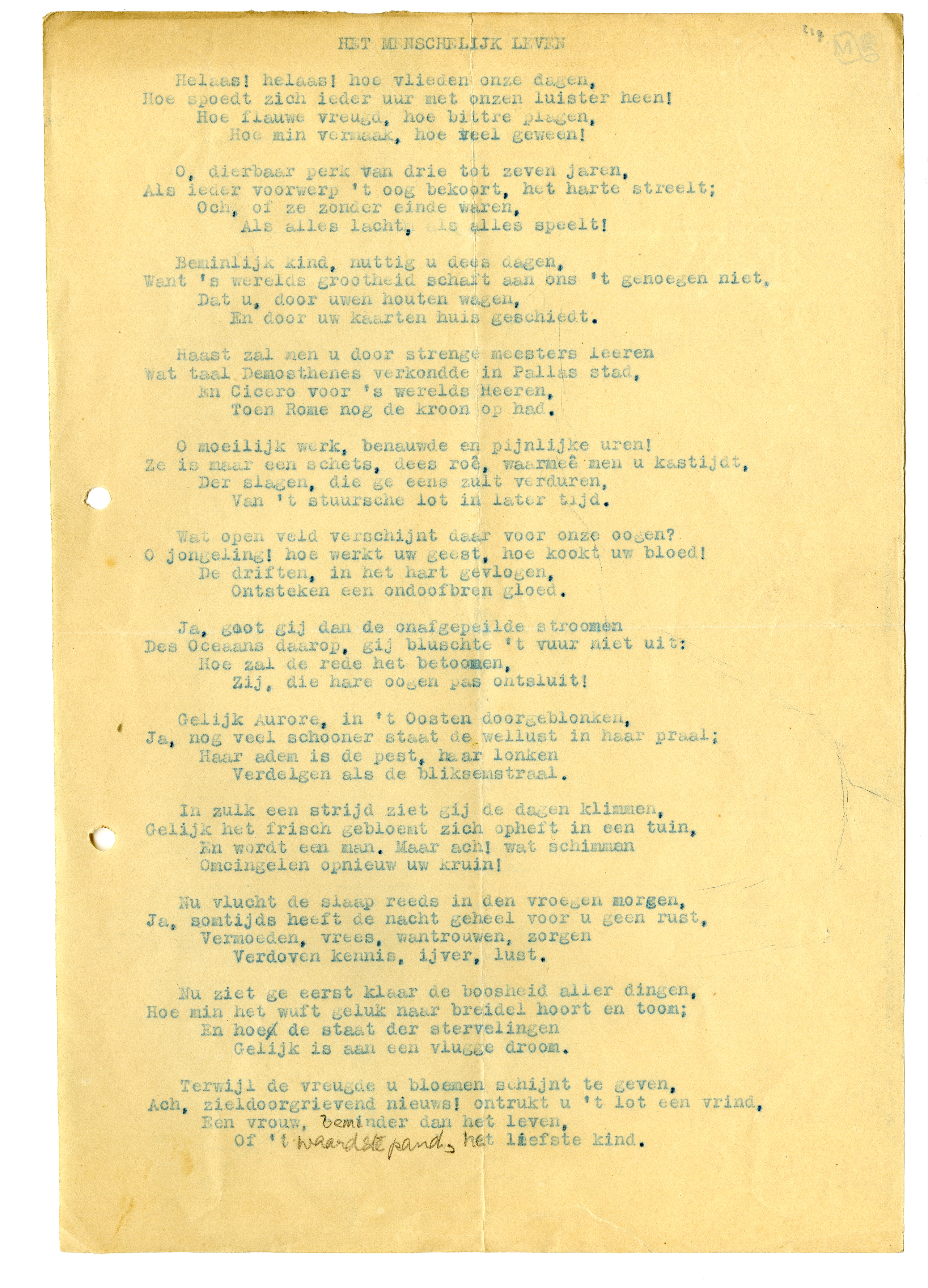 4789Tekst geschreven op een getypte kopie van het 27 strofen tellende gedicht Het menschlijk leeven van W. van Haren (Amsterdam 1760).