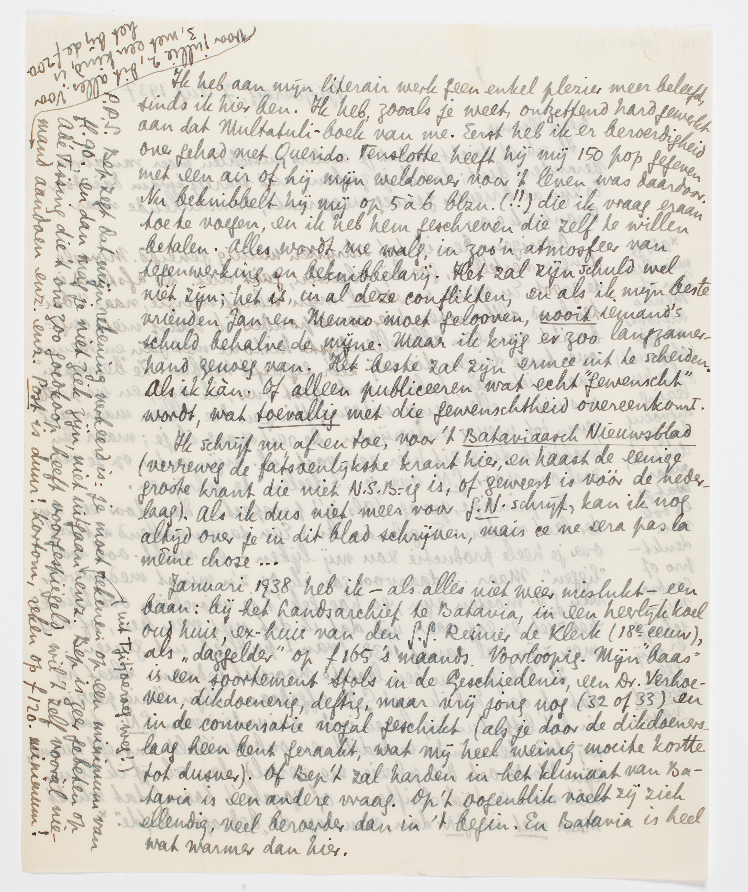 Januari 1938 heb ik - als alles niet weer mislukt - een baan: bij het Landsarchief te Batavia, in een heerlijk koel oud huis, ex-huis van den G.G. Reinier de Klerk (18e eeuw), als ‘daggelder’ op f 165 's maands. Voorloopig. Mijn ‘baas’ is een soortement Stols in de Geschiedenis, een Dr. Verhoeven, dikdoenerig, deftig, maar vrij jong nog (32 of 33) en in de conversatie nogal geschikt (als je door de dikdoeners-laag heen bent geraakt, wat mij heel weinig moeite kostte tot dusver). Of Bep 't zal harden in het klimaat van Batavia is een andere vraag. Op 't oogenblik voelt zij zich ellendig, veel beroerder dan in 't begin. En Batavia is heel wat warmer dan hier.