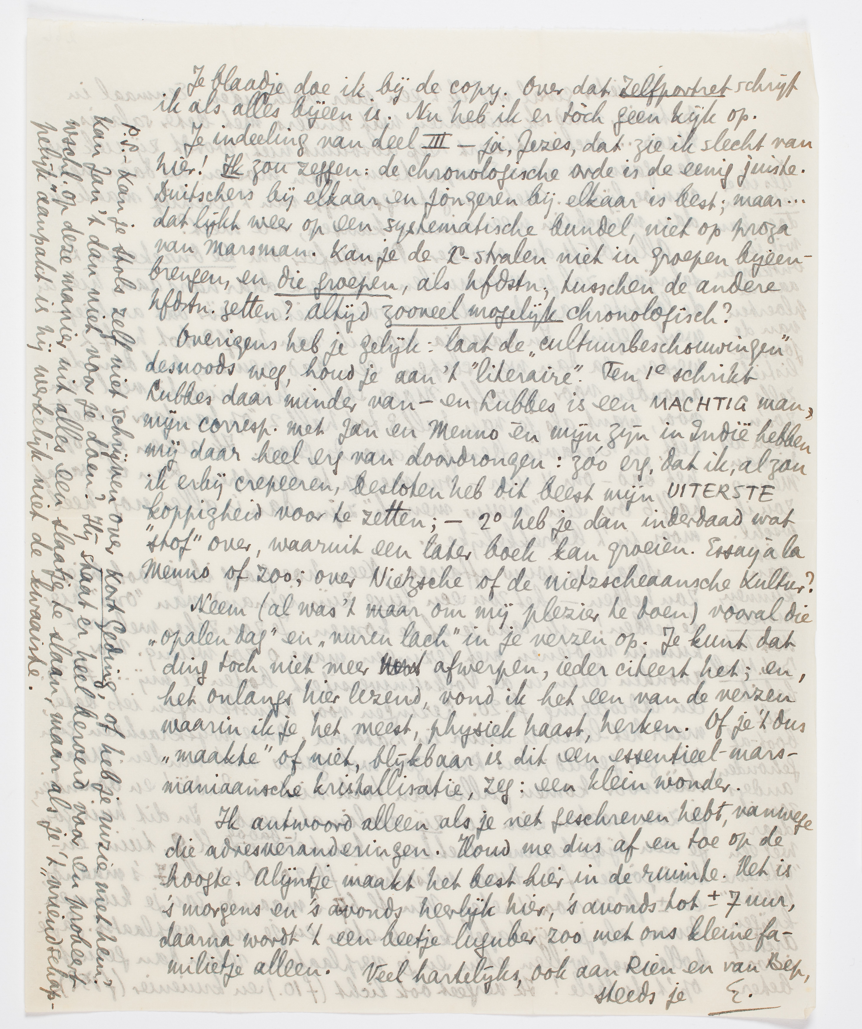Overigens heb je gelijk: laat de ‘cultuurbeschouwingen’ desnoods weg, houd je aan 't ‘literaire’. Ten 1e schrikt Lubbes daar minder van - en Lubbes is een MACHTIG man, mijn corresp. met Jan en Menno èn mijn zijn in Indië hebben mij daar heel erg van doordrongen: zóo erg, dat ik, al zou ik erbij crepeeren, besloten heb dit beestje mijn UITERSTE koppigheid voor te zetten; - 2o heb je dan inderdaad wat ‘stof’ over, waaruit een later boek kan groeien. Essay à la Menno of zoo; over Nietzsche of de nietzscheaansche Kultur?4812