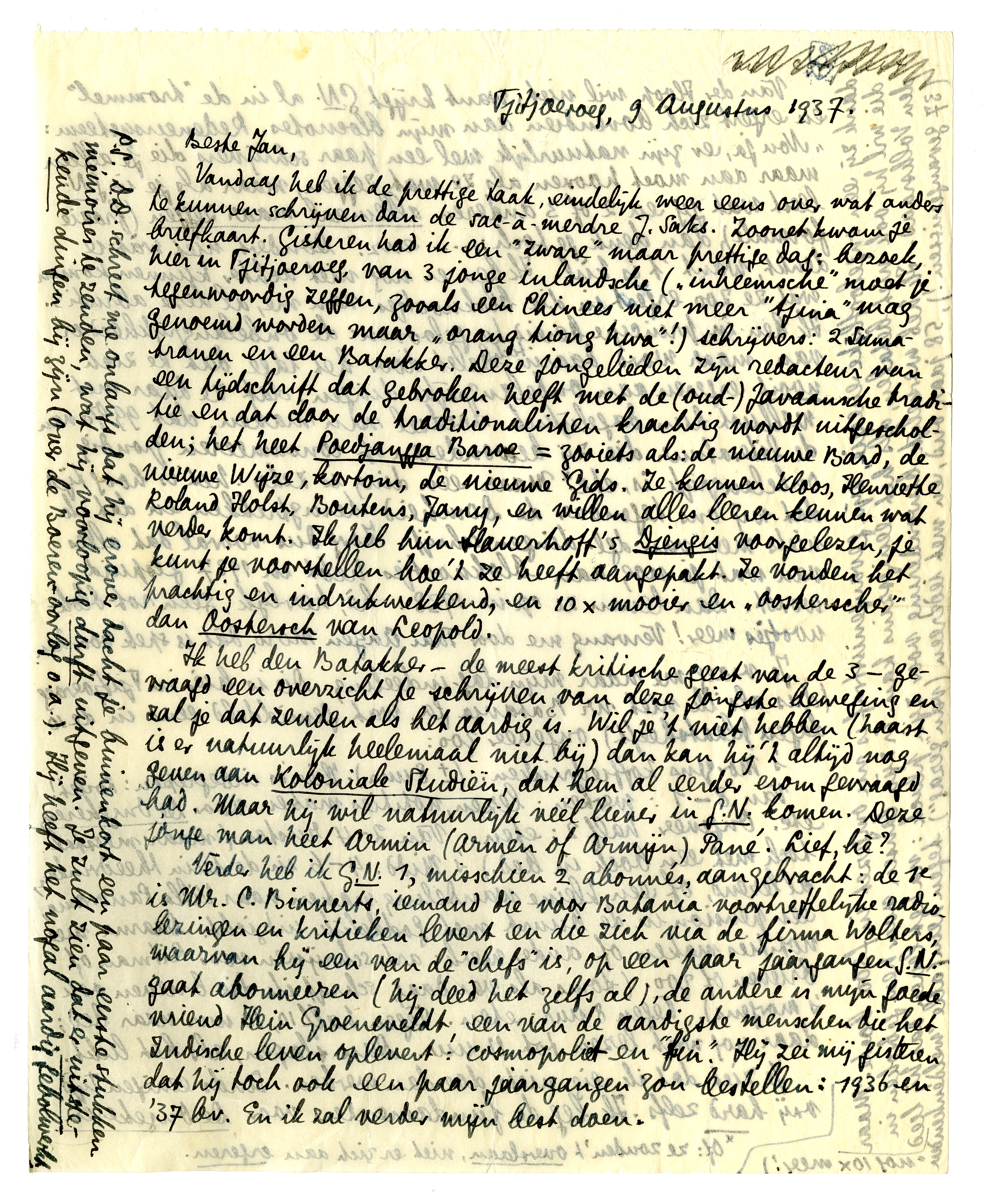 Vandaag heb ik de prettige taak, eindelijk weer eens over wat anders te kunnen schrijven dan de sac-à-merde J. Saks. Zoonet kwam je briefkaart. Gisteren had ik een ‘zware’ maar prettige dag: bezoek, hier in Tjitjoeroeg, van 3 jonge inlandsche (‘inheemsche’ moet je tegenwoordig zeggen, zooals een Chinees niet meer ‘tjina’ mag genoemd worden maar ‘orang tiong hwa’!) schrijvers: 2 Sumatranen en een Batakker. Deze jongelieden zijn redacteur van een tijdschrift dat gebroken heeft met de (oud-) Javaansche traditie en dat door de traditionalisten krachtig wordt uitgescholden; het heet Poedjangga Baroe = zooiets als: de nieuwe Bard, de nieuwe Wijze, kortom, de nieuwe Gids. Ze kennen Kloos, Henriette Roland Holst, Boutens, Jany, en willen alles leeren kennen wat verder komt. Ik heb hun Slauerhoff's Djengis voorgelezen, je kunt je voorstellen hoe't ze heeft aangepakt. Ze vonden het prachtig en indrukwekkend, en 10 × mooier en ‘oosterscher’ dan Oostersch van Leopold.