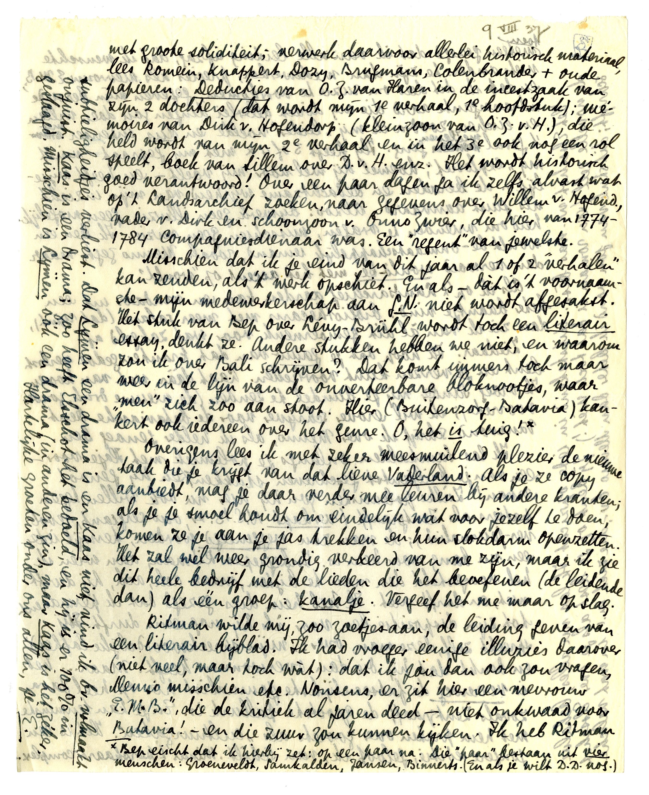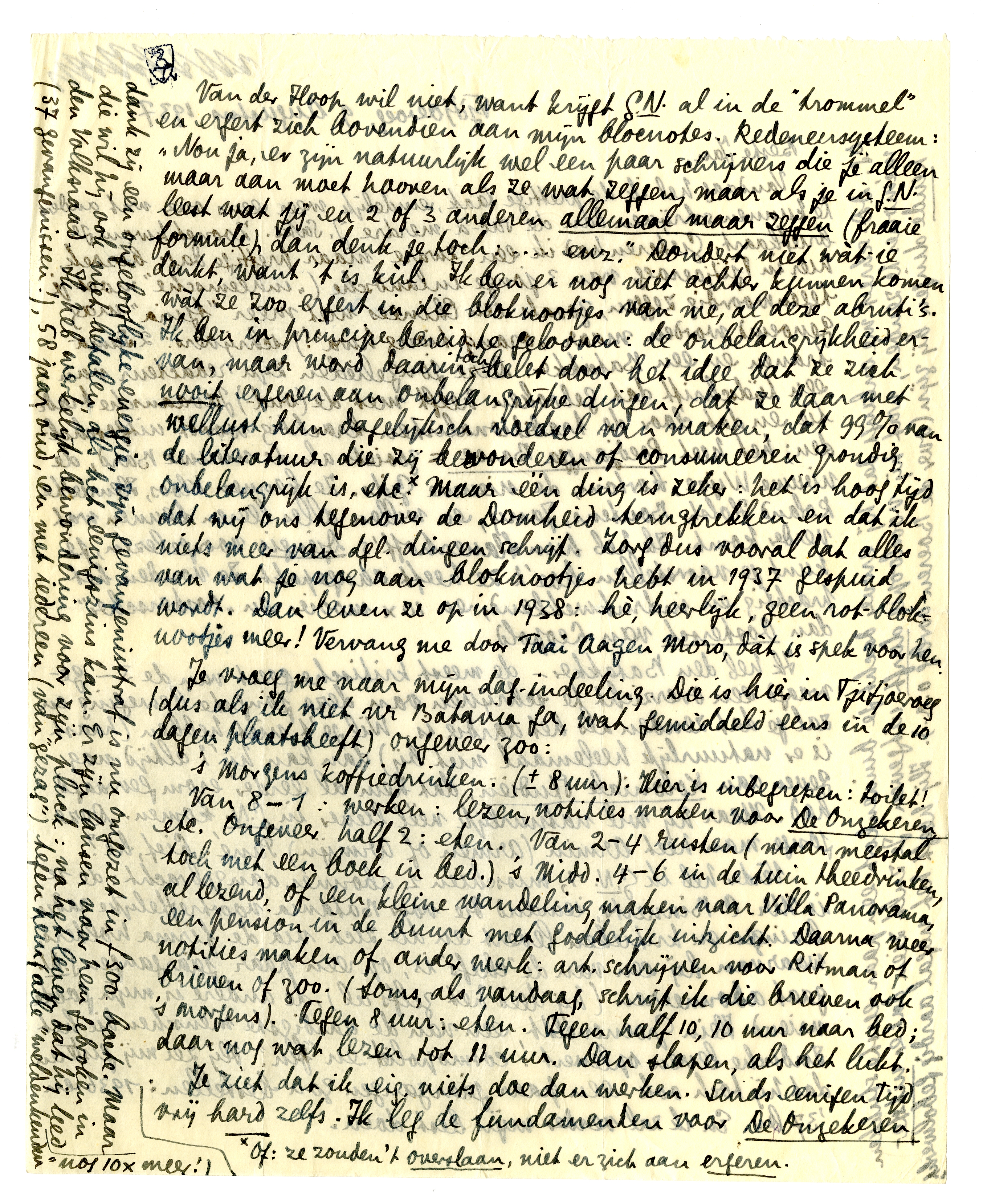Misschien dat ik je eind van dit jaar al 1 of 2 ‘verhalen’ kan zenden, als 't werk opschiet. En als - dàt is 't voornaamste - mijn medewerkerschap aan G.N. niet wordt afgesakst. Het stuk van Bep over Lévy-Brühl4816 wordt toch een literair essay, denkt ze. Andere stukken hebben we niet, en waarom zou ik over Bali schrijven? Dat komt immers toch maar weer in de lijn van de onverteerbare bloknootjes, waar ‘men’ zich zoo aan stoot. Hier (Buitenzorg-Batavia) kankert ook iedereen over het genre. O, het is tuig!*