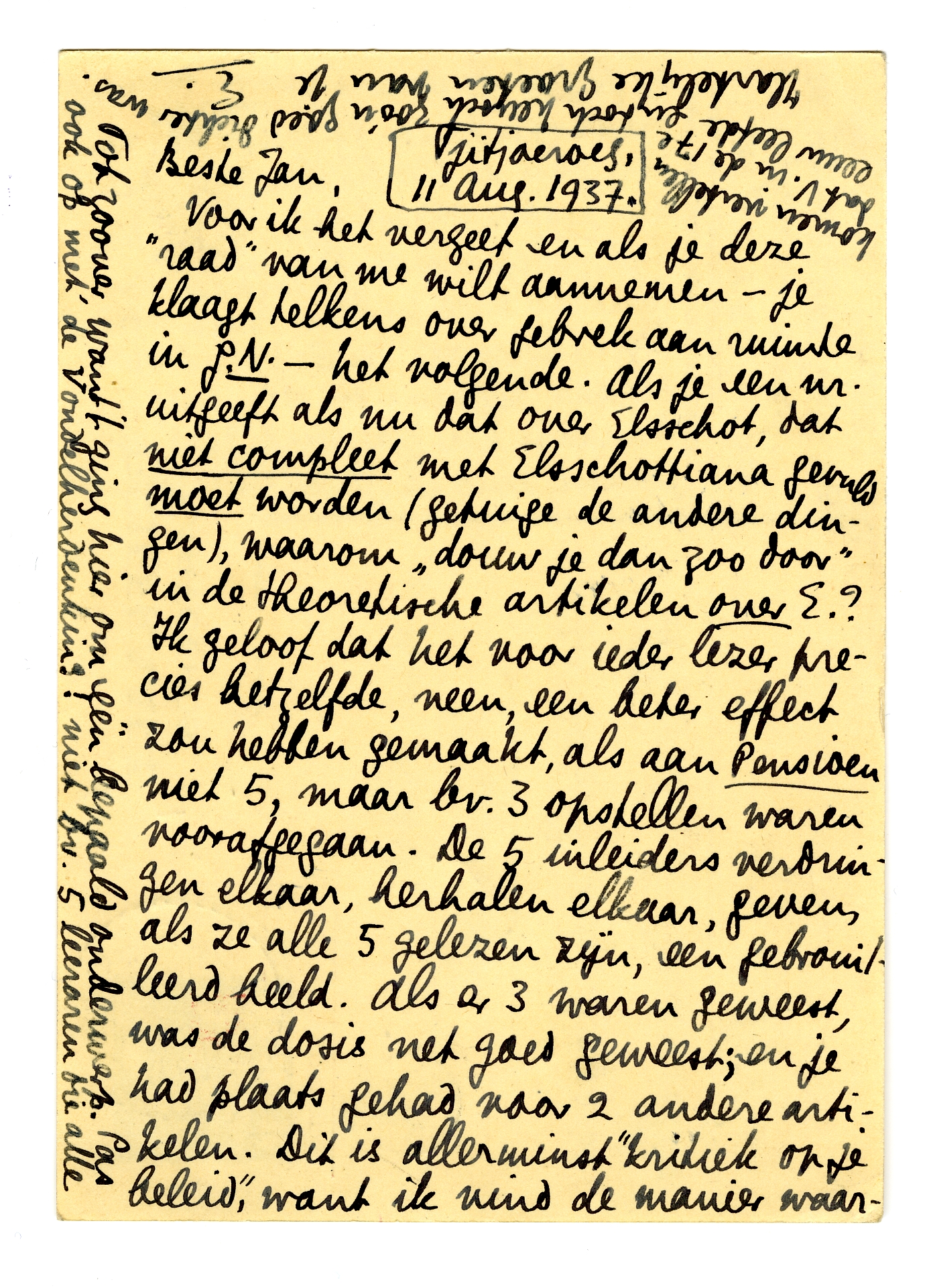 Voor ik het vergeet en als je deze ‘raad’ van me wilt aannemen - je klaagt telkens over gebrek aan ruimte in G.N. - het volgende. Als je een nr. uitgeeft als nu dat over Elsschot, dat niet compleet met Elschottiana gevuld moet worden (getuige de andere dingen), waarom ‘douw je dan zoo door’ in de theoretische artikelen over E.?