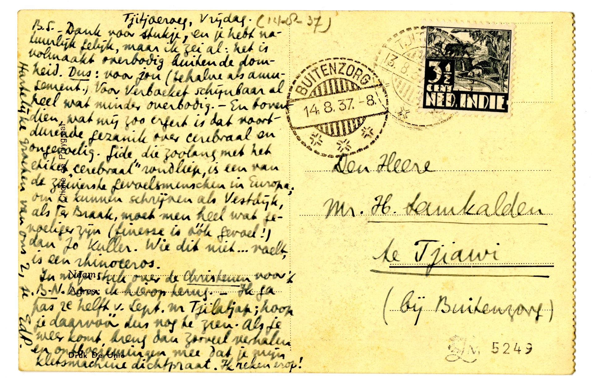 In mijn stuk over de Christenen voor 't B.N. kom ik hierop terug. - Ik ga pas 2e helft v. Sept. nr Tjilatjap; hoop je daarvóór dus nog te zien. Als je weer komt, breng dan zooveel verhalen en ontboezemingen mee dat je mijn kletsmachine dichtpraat. Ik reken erop!