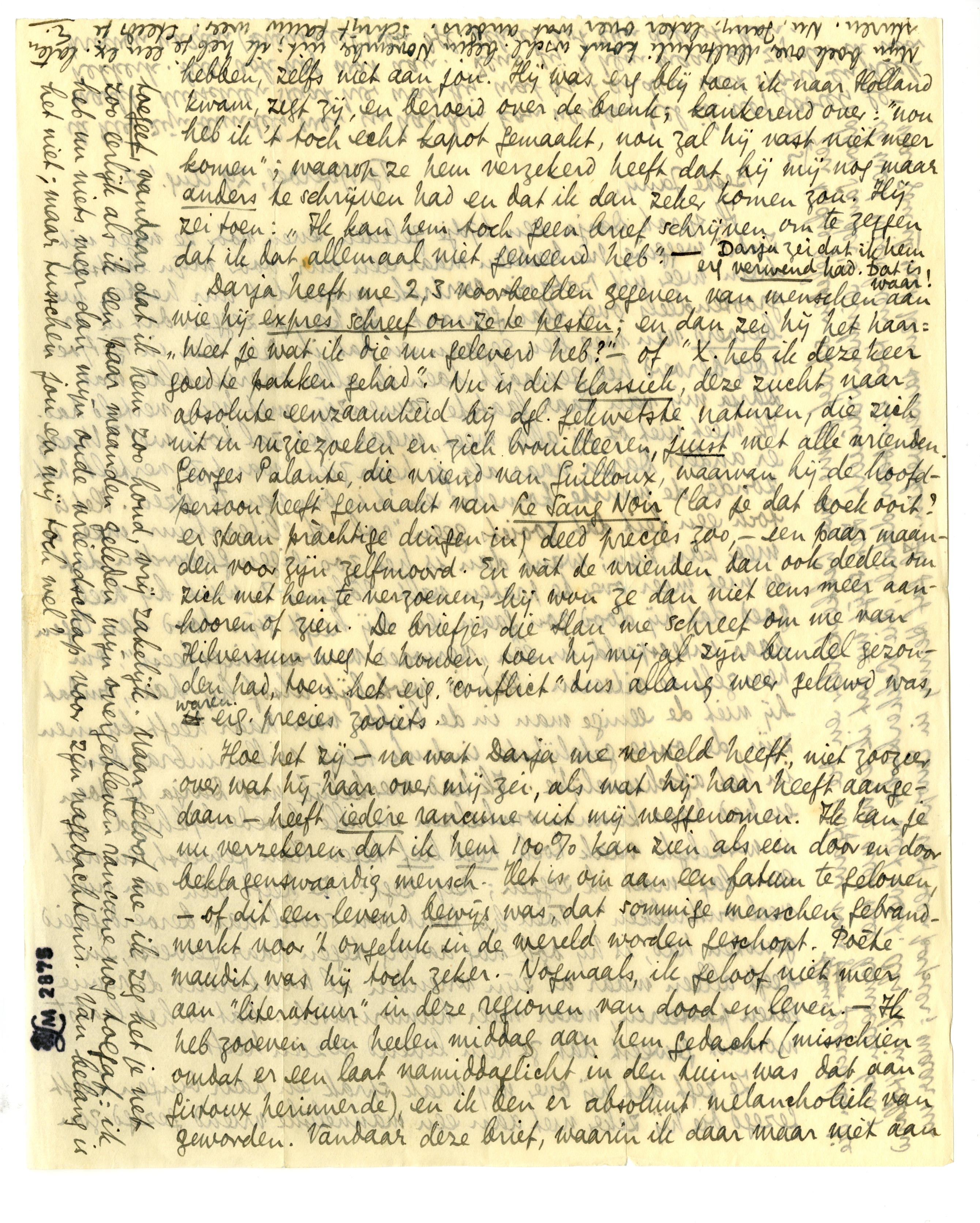 Darja heeft me 2, 3 voorbeelden gegeven van menschen aan wie hij expres schreef om ze te pesten; en dan zei hij het haar: ‘Weet je wat ik diè nu geleverd heb?’ - of ‘X. heb ik deze keer goed te pakken gehad’. Nu is dit klassiek, deze zucht naar absolute eenzaamheid bij dgl. gekwetste naturen, die zich uit in ruzie zoeken en zich brouilleeren, juist met alle vrienden. Georges Palante, die vriend van Guilloux, waarvan hij de hoofdpersoon heeft gemaakt van Le Sang Noir (las je dat boek ooit, er staan pràchtige dingen in) deed precies zoo, - een paar maanden voor zijn zelfmoord. En wàt de vrienden dan ook deden om zich met hem te verzoenen, hij wou ze dan niet eens meer aanhooren of zien. De briefjes die Slau me schreef om me van Hilversum weg te houden, toen hij mij al zijn bundel4867 gezonden had, toen het eig. ‘conflict’ dus allang weer geluwd was, waren eig. precies zooiets.