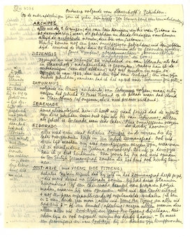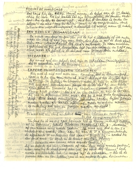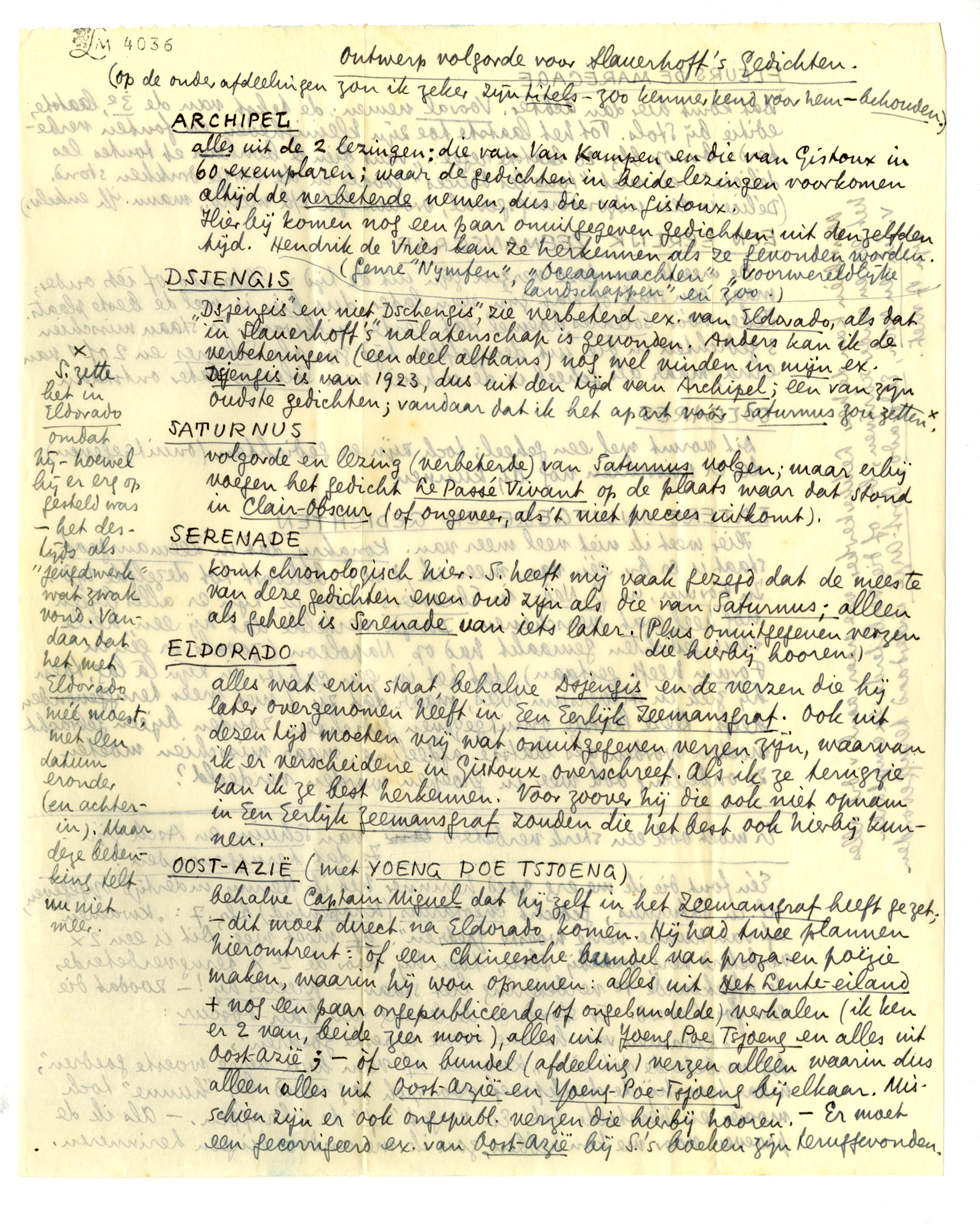behalve Captain Miguel dat hij zelf in het Zeemansgraf heeft gezet; - dit moet direct na Eldorado komen. Hij had twee plannen hieromtrent: òf een Chineesche bundel van proza en poëzie maken, waarin hij wou opnemen: alles uit Het Lente-eiland + nog een paar ongepubliceerde (of ongebundelde) verhalen (ik ken er 2 van, beide zeer mooi), alles uit Yoeng Poe Tsjoeng en alles uit Oost-Azië; - òf een bundel (afdeeling) verzen alleen waarin dus alleen alles uit Oost-Azië en Yoeng-Poe-Tsjoeng bij elkaar. Misschien zijn er ook ongepubl. ver-zen die hierbij hooren. - Er moet een gecorrigeerd ex. van Oost-Azië bij S.'s boeken zijn teruggevonden.