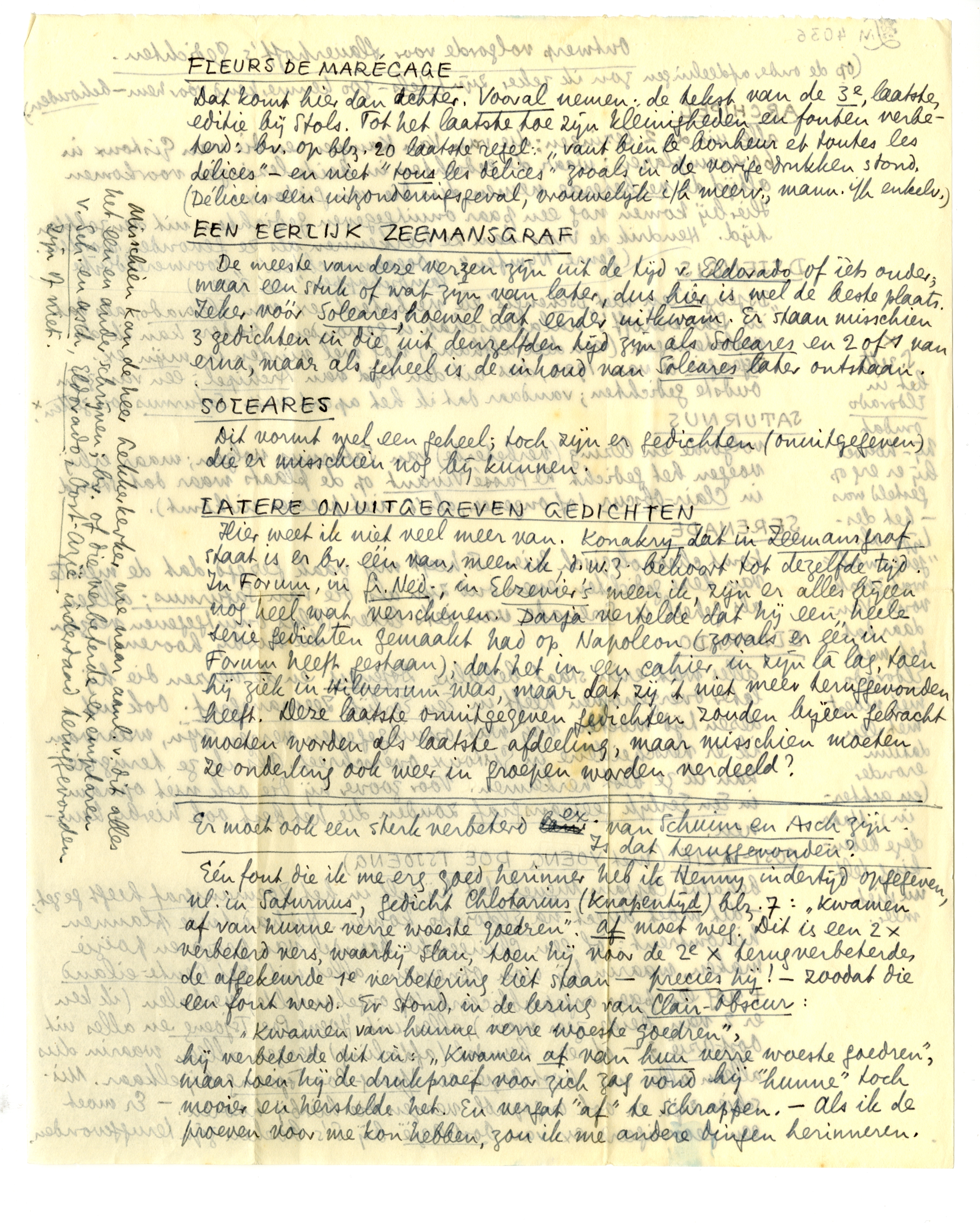 alles wat erin staat, behalve Dsjengis en de verzen die hij later overgenomen heeft in Een Eerlijk Zeemansgraf. Ook uit dezen tijd moeten vrij wat onuitgegeven verzen zijn, waarvan ik er verscheidene in Gistoux overschreef. Als ik ze terugzie kan ik ze best herkennen. Voor zover hij die ook niet opnam in Een Eerlijk Zeemansgraf zouden die het best ook hierbij kunnen.