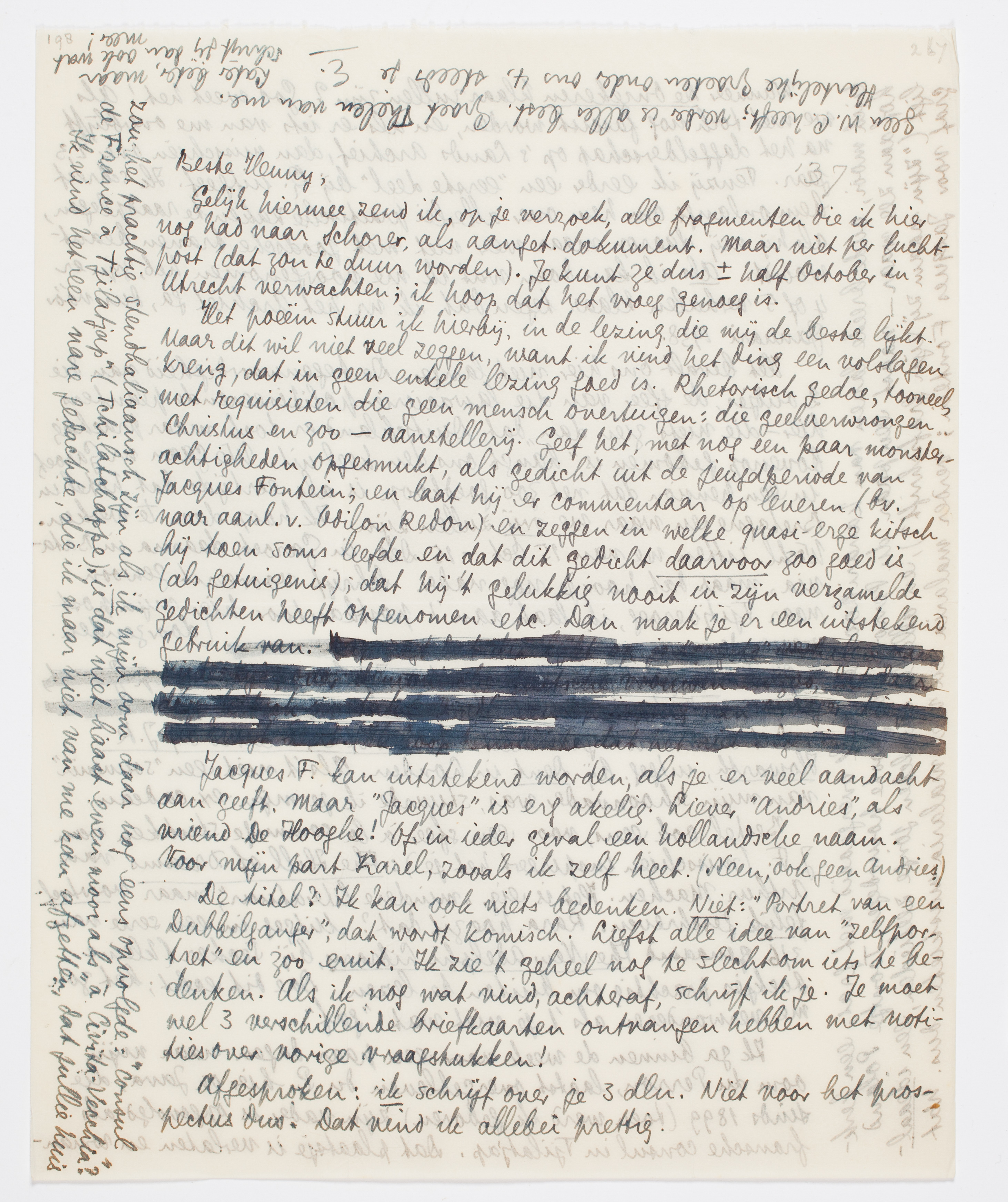 Het poeëm stuur ik hierbij, in de lezing die mij de beste lijkt. Maar dit wil niet veel zeggen, want ik vind het ding een volslagen kreng, dat in geen enkele lezing goed is. Rhetorisch gedoe, tooneel, met requisieten die geen mensch overtuigen: die geelverwrongen Christus en zoo - aanstellerij. Geef het, met nog een paar monsterachtigheden opgesmukt, als gedicht uit de jeugdperiode van Jacques Fontein; en laat hij er commentaar opleveren (bv. naar aanl. v. Odilon Redon) en zeggen in welke quasi-erge kitsch hij toen soms leefde en dat dit gedicht daarvoor zoo goed is (als getuigenis); dat hij 't geluk-kig nooit in zijn verzamelde gedichten heeft opgenomen etc. Dan maak je er een uitstekend gebruik van.4907