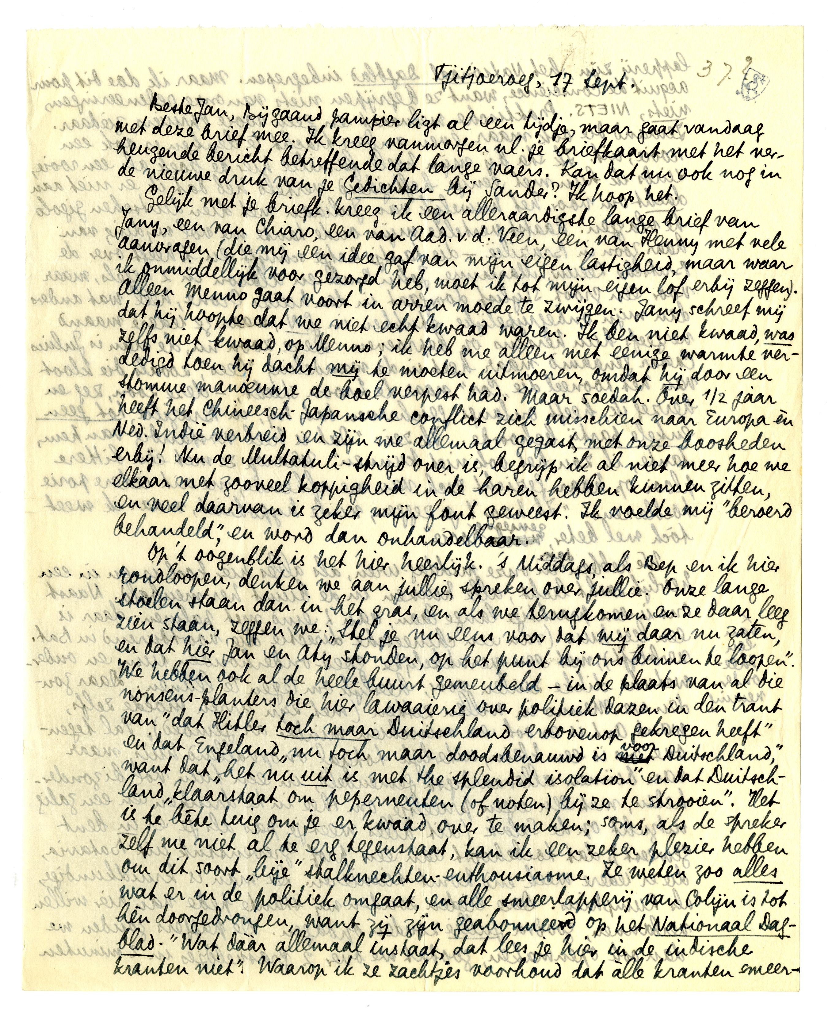 Gelijk met je briefk. kreeg ik een alleraardigste lange brief van Jany, een van Chiaro, een van Aad v.d. Veen, een van Henny met vele aanvragen (die mij een idee gaf van mijn eigen lastigheid, maar waar ik onmiddellijk voor gezorgd heb, moet ik tot mijn eigen lof erbij zeggen). Alleen Menno gaat voort in arren moede te zwijgen.4917 Jany schreef mij dat hij hoopte dat we niet echt kwaad waren. Ik ben niet kwaad, was zelfs niet kwaad, op Menno; ik heb me alleen met eenige warmte verdedigd toen hij dacht mij te moeten uitmoeren, omdat hij door een stomme manoeuvre de boel verpest had. Maar soedah. Over ½ jaar heeft het Chineesch-Japansche conflict zich misschien naar Europa èn Ned. Indië verbreid en zijn we allemaal gegast, met onze boosheden erbij! Nu de Multatuli-strijd over is, begrijp ik al niet meer hoe we elkaar met zooveel koppigheid in de haren hebben kunnen zitten, en veel daarvan is zeker mijn fout geweest. Ik voelde mij ‘beroerd behandeld’, en word dan onhandelbaar.