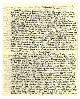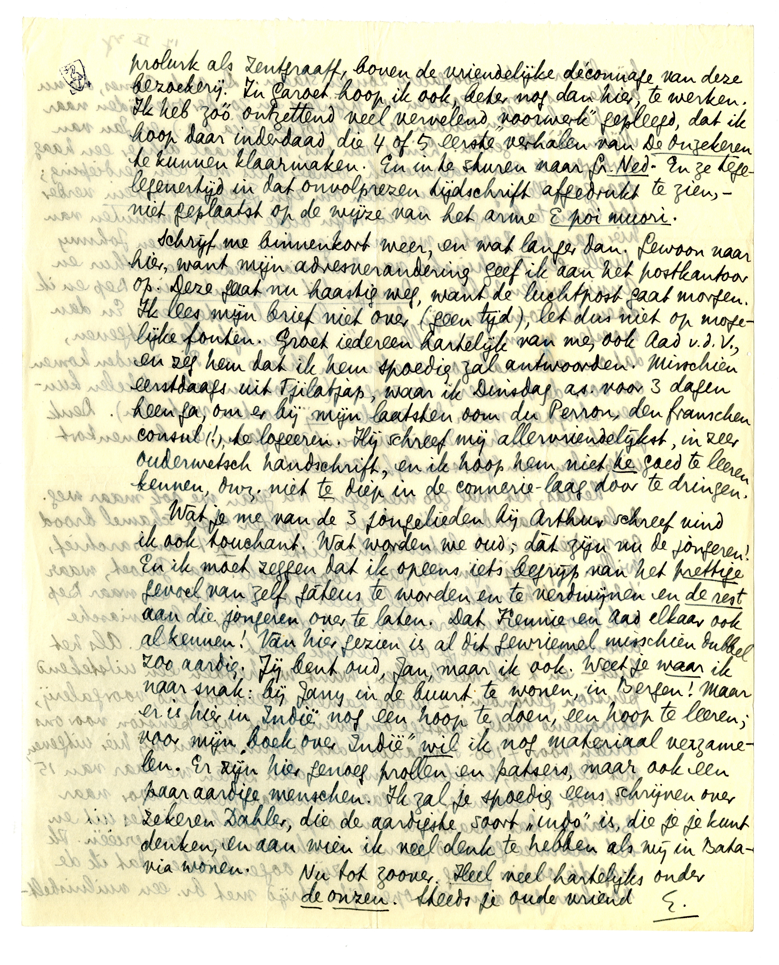 Schrijf me binnenkort weer, en wat langer dan. Gewoon naar hier, want mijn adresverandering geef ik aan het postkantoor op. Deze gaat nu haastig weg, want de luchtpost gaat morgen. Ik lees mijn brief niet over (geen tijd), let dus niet op mogelijke fouten. Groet iedereen hartelijk van me, ook Aad v.d. V., en zeg hem dat ik hem spoedig zal antwoorden. Misschien eerstdaags uit Tjilatjap, waar ik Dinsdag as. voor 3 dagen heen ga, om er bij mijn laatsten oom du Perron, den franschen consul (!) te logeeren. Hij schreef mij allervriendelijkst, in zeer ouderwetsch handschrift, en ik hoop hem niet te goed te leeren kennen, dwz. niet te diep in de connerie-laag door te dringen.
