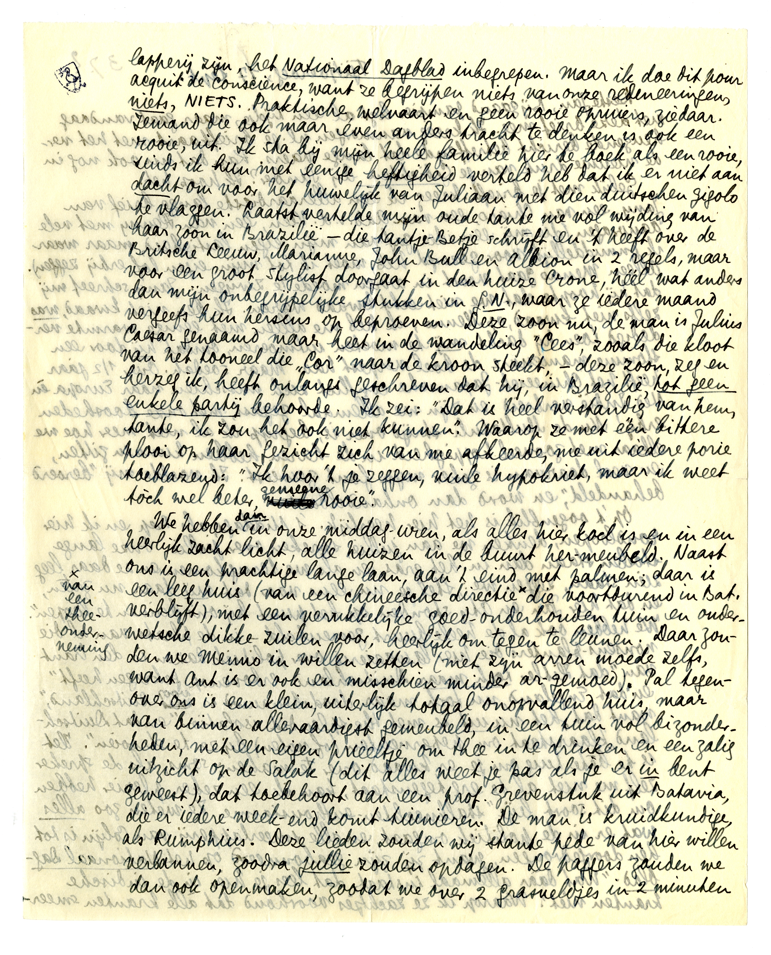We hebben dan in onze middag-uren, als alles hier koel is en in een heerlijk zacht licht, alle huizen in de buurt her-meubeld. Naast ons is een prachtige lange laan, aan 't eind met palmen; daar is een leeg huis (van een chineesche directie* die voortdurend in Bat. verblijft), met een verrukkelijke goed-onderhouden tuin en ouderwetsche dikke zuilen voor, heerlijk om tegen te leunen. Daar zouden we Menno in willen zetten (met zijn arren moede zelfs, want Ant is er ook en misschien minder ar-gemoed). Pal tegenover ons is een klein, uiterlijk totaal onopvallend huis, maar van binnen alleraardigst gemeubeld, in een tuin vol bizonderheden, met een eigen prieeltje om thee in te drinken en een zalig uitzicht op de Salak (dit alles weet je pas als je er in bent geweest), dat toebehoort aan een prof. Grevenstuk uit Batavia, die er iedere week-end komt tuinieren. De man is kruidkundige, als Rumphius.4921 Deze lieden zouden wij stante pede van hier willen verbannen, zoodra jullie zouden opdagen. De paggers zouden we dan ook openmaken, zoodat we over 2 grasveldjes in 2 minuten bij elkaar in de voorgalerij zouden staan. De oude Crones, die nu achter ons wonen, zouden we pijnloos en zonder overlijden naar den hemel willen zenden (als de profeet Elia o.a.), en Jan van Nijlen dààr zetten. Links van ons, heelemaal achter een haag verborgen, is een ouderwetsch, somber huis met een verdieping; daar zou Henny moeten zitten om zijn Jacques Fontein verder tot leven te brengen. En in mijn oude huis, 10 minuten van hier, aan den grooten weg, nu eigendom van zekeren Johnny Duell, een Tuschinsky van Batavia,4922 zouden we Arthur en Annie willen hebben. Denk je dit 5 minuten in. Bep en ik doen het soms, en zijn dan heelemaal verteederd. En dan moesten we met z'n allen één fatsoenlijk blad uitgeven, dat ons allemaal zou voeden, en Chiaro en Pia zouden komen om voor de drukkerij te zorgen (ze zouden ook artikelen kunnen schrij-ven, maar die zouden wij moeten vertalen). Denk je ook eens in hoe Indië vooruit zou gaan, en binnenkort uitpuilen van ‘fatsoenlijke geesten’!