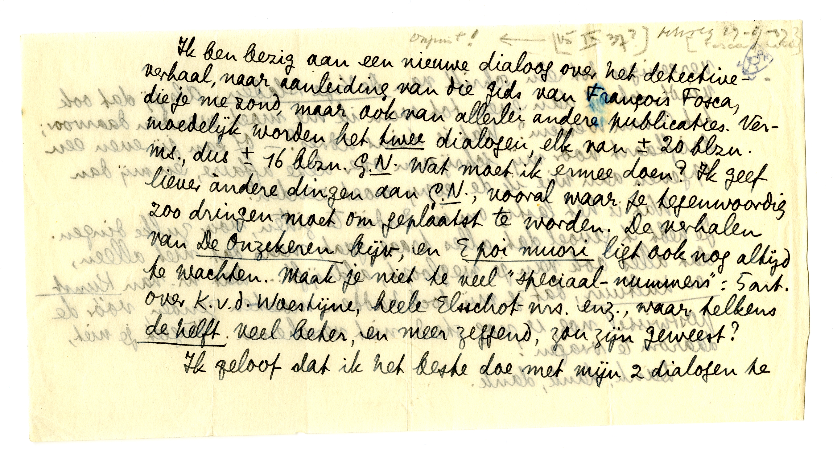 Ik ben bezig aan een nieuwe dialoog over het detective-verhaal, naar aanleiding van die gids van François Fosca, die je me zond, maar ook van allerlei andere publicaties. Vermoedelijk worden het twee dialogen, elk van ± 20 blzn. ms., dus ± 16 blzn. G.N. Wat moet ik ermee doen? Ik geef liever àndere dingen aan G.N., vooral waar je tegenwoordig zoo dringen moet om geplaatst te worden. De verhalen van De Onzekeren bijv., en E poi muori ligt ook nog altijd te wachten. Maak je niet te veel ‘speciaal-nummers’: 5 art. over K.v.d. Woestijne, heele Elsschot-nrs. enz., waar telkens de helft veel beter, en meer zeggend, zou zijn geweest?
