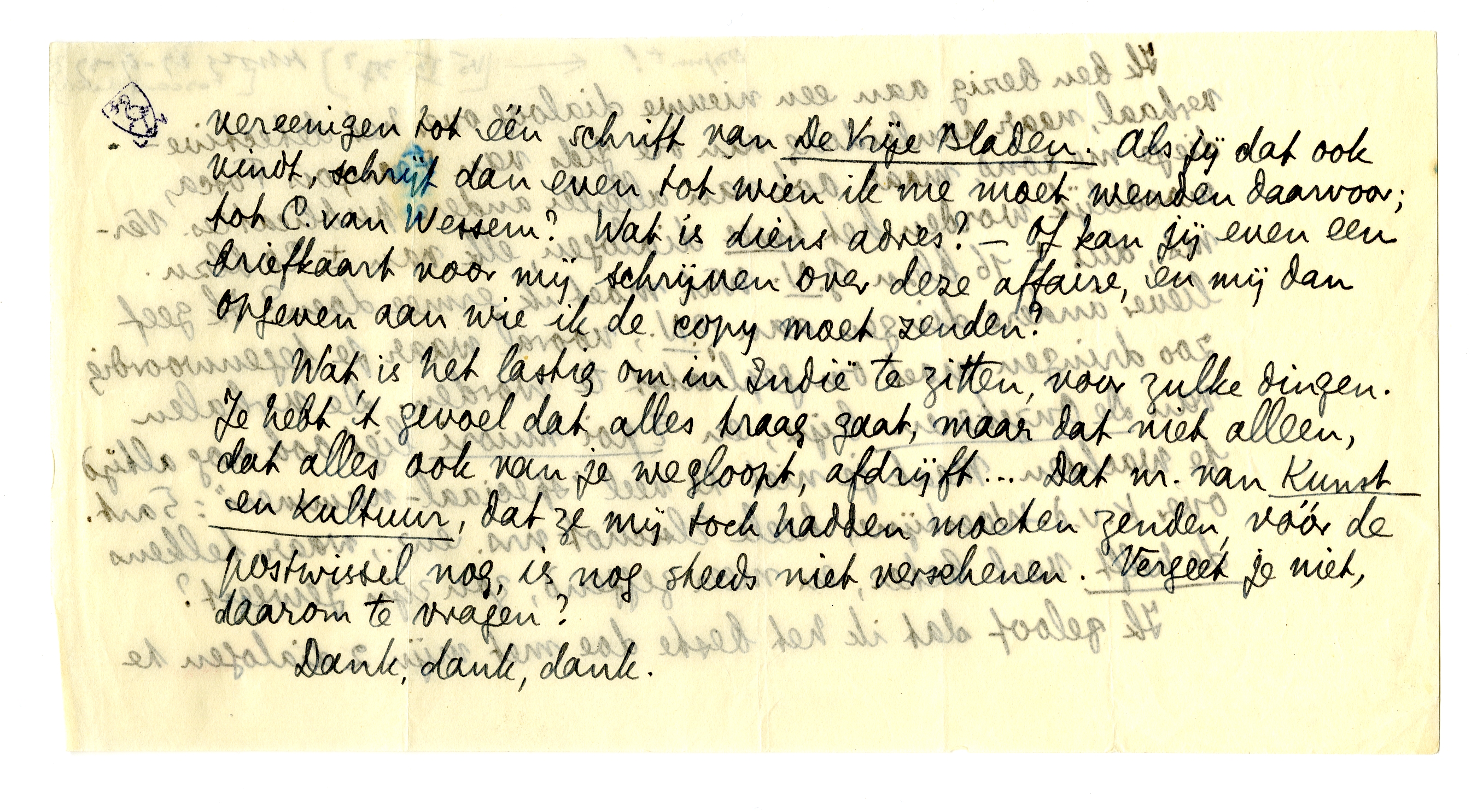 Wat is het lastig om in Indië te zitten, voor zulke dingen. Je hebt 't gevoel dat alles traag gaat, maar dat niet alleen, dat alles ook van je wegloopt, afdrijft... Dat nr. van Kunst en Kultuur, dat ze mij toch hadden moeten zenden, vóór de postwissel nog, is nog steeds niet verschenen. Vergeet je niet, daarom te vragen?