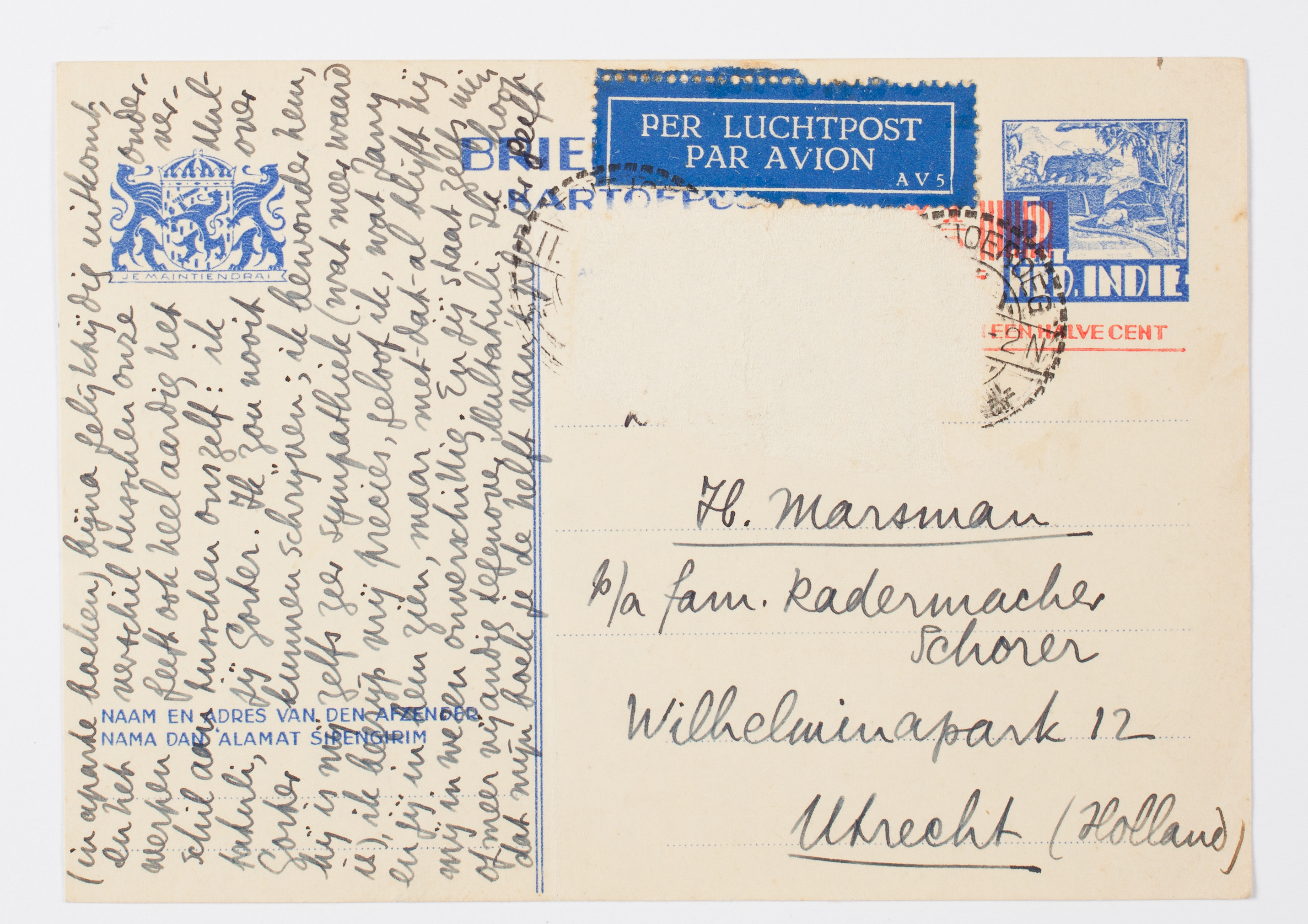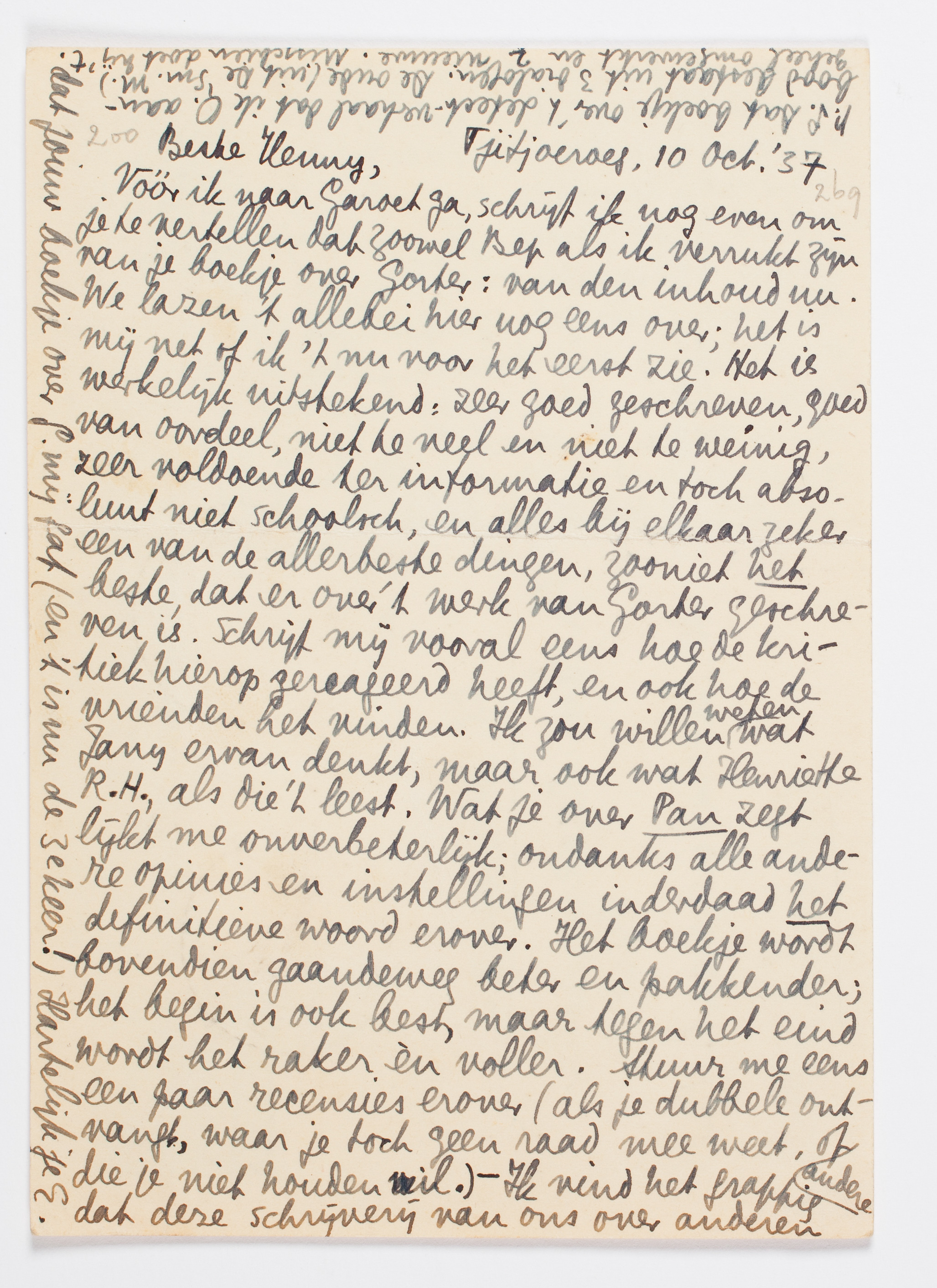 Vóór ik naar Garoet ga, schrijf ik nog even om je te vertellen dat zoowel Bep als ik verrukt zijn van je boekje over Gorter:4942 van den inhoud nu. We lazen 't allebei hier nog eens over; het is mij net of ik 't nu voor het eerst zie. Het is werkelijk uitstekend: zeer goed geschreven, goed van oordeel, niet te veel en niet te weinig, zeer voldoende ter informatie en toch absoluut niet schoolsch, en alles bij elkaar zeker een van de allerbeste dingen, zooniet het beste, dat er over 't werk van Gorter geschreven is. Schrijf mij vooral eens hoe de kritiek hierop gereageerd heeft, en ook hoe de vrienden het vinden. Ik zou willen weten wat Jany ervan denkt, maar ook wat Henriette R.H., als die 't leest. Wat je over Pan zegt lijkt me onverbeter-lijk; ondanks alle andere opinies en instellingen inderdaad het definitieve woord erover.4943 Het boekje wordt bovendien gaandeweg beter en pakkender; het begin is ook best, maar tegen het eind wordt het raker èn voller. Stuur me eens een paar recensies erover (als je dubbele ontvangt, waar je toch geen raad mee weet, of andere die je niet houden wil.) - Ik vind het grappig dat deze schrijverij van ons over anderen (in aparte boeken) bijna gelijktijdig uitkomt, en het verschil tusschen onze onderwerpen geeft ook heel aardig het verschil aan tusschen onszelf: ik Multatuli, jij Gorter. Ik zou nooit over Gorter kunnen schrijven; ik bewonder hem, hij is mij zelfs zeer sympathiek (wat meer waard is), ik begrijp vrij precies, geloof ik, wat Jany en jij in hem zien, maar met-dat-al blijft hij mij in wezen onverschillig. En jij staat zelfs min of meer vijandig tegenover Multatuli. Ik hoop dat mijn boekje de helft van 't plezier geeft dat jouw boekje over G. mij gaf (en 't is nu de 3e keer!) Hartelijk je