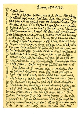 Sinds 2 dagen zitten we hier dan. Het plaatsje is allerliefst, maar het kan hier een waar tochtgat zijn als de ‘wind van de bergen’ loskomt, en dat is nu al 2 dagen 't geval (met en zonder regen). Alijntje is er wat ziek van, en Bep heeft het zoowaar nu koud! Ik ben suf, wschl. van de klimaatsverandering, maar voel me toch wel prettig, vooral nu het in onze kamers naar onszelf begint te ruiken. Ik hoop spoedig weer te pennen (maar o! deze rotpen van jou!) Het zou me ontzettend spijten als we van hier nr Batavia gingen zonder dat ik veel uitgevoerd had. Maar als mijn kop maar weer helder wordt is dat uitgesloten, al zou ik er alle correspondentie en soortgelijke bijwerkjes voor stop zetten. Dat vergeven jullie me dan wel.