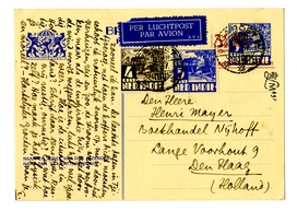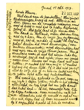 Het waait hier geducht in Garoet, waar we nu sinds 2 dagen zitten; verder is het plaatsje allerliefst en Bep heeft het nu zelfs koud! Dat Indië toch... Ik zie, vanwege Bep, erg op tegen Batavia. Maar misschien valt het mee. Misschien ziet de wereld er ook al anders uit, tegen dat ik daar verwacht word. Op 't oogenblik tracht ik hier te werken zooveel ik kan. De laatste dagen in Tjitjoeroeg, net toen de koffers dicht moesten, schoot ik natuurlijk enorm op, nu is door het verhuizen, reis en zoo, de stroom weer verbroken, maar als de inspiratie hier niet door de wind wordt weggeblazen, lukt het wel spoedig weer. - Hoe is de situatie in Holland? Schrijf daar eens over. Rustig, vrij rustig, onrustig? En wat doe je zelf? Hoe maak je het, fysiek en moreel? - Hartelijke groeten van je
