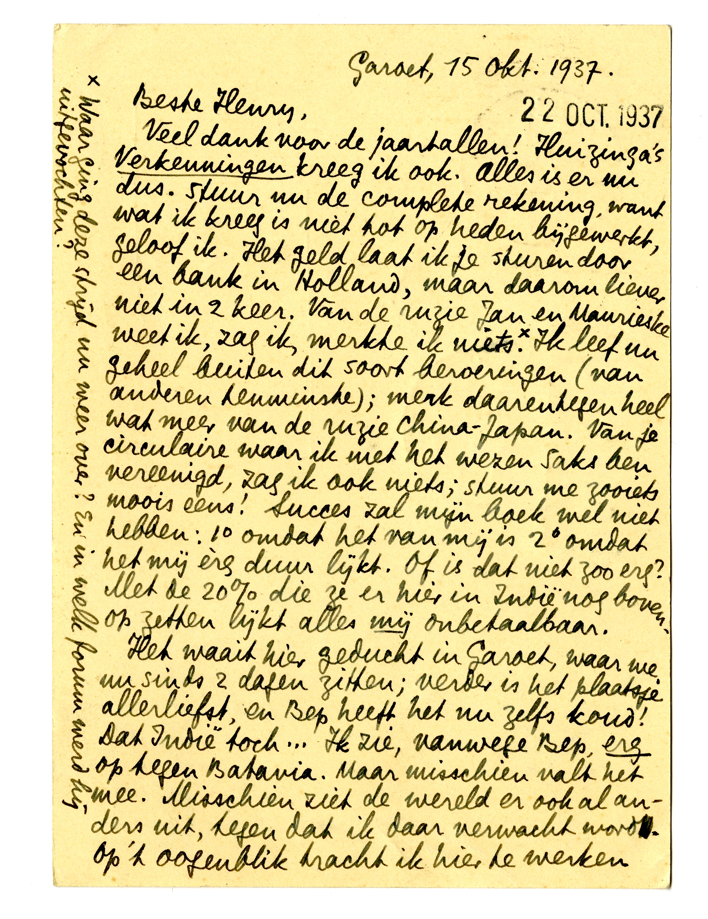 Veel dank voor de jaartallen! Huizinga's Verkenningen kreeg ik ook. Alles is er nu dus. Stuur nu de complete rekening, want wat ik kreeg is niet tot op heden bijgewerkt, geloof ik. Het geld laat ik je sturen door een bank in Holland, maar daarom liever niet in 2 keer. Van de ruzie Jan en Maurieske weet ik, zag ik, merkte ik niets.* Ik leef nu geheel buiten dit soort beroeringen (van anderen tenminste); merk daarentegen heel wat meer van de ruzie China-Japan. Van je circulaire waar ik met het wezen Saks ben vereenigd, zag ik ook niets; stuur me zooiets moois eens!4948 Succes zal mijn boek wel niet hebben: 1o omdat het van mij is 2o omdat het mij èrg duur lijkt. Of is dat niet zoo erg? Met de 20% die ze er hier in Indië nog bovenop zetten lijkt alles mij onbetaalbaar.