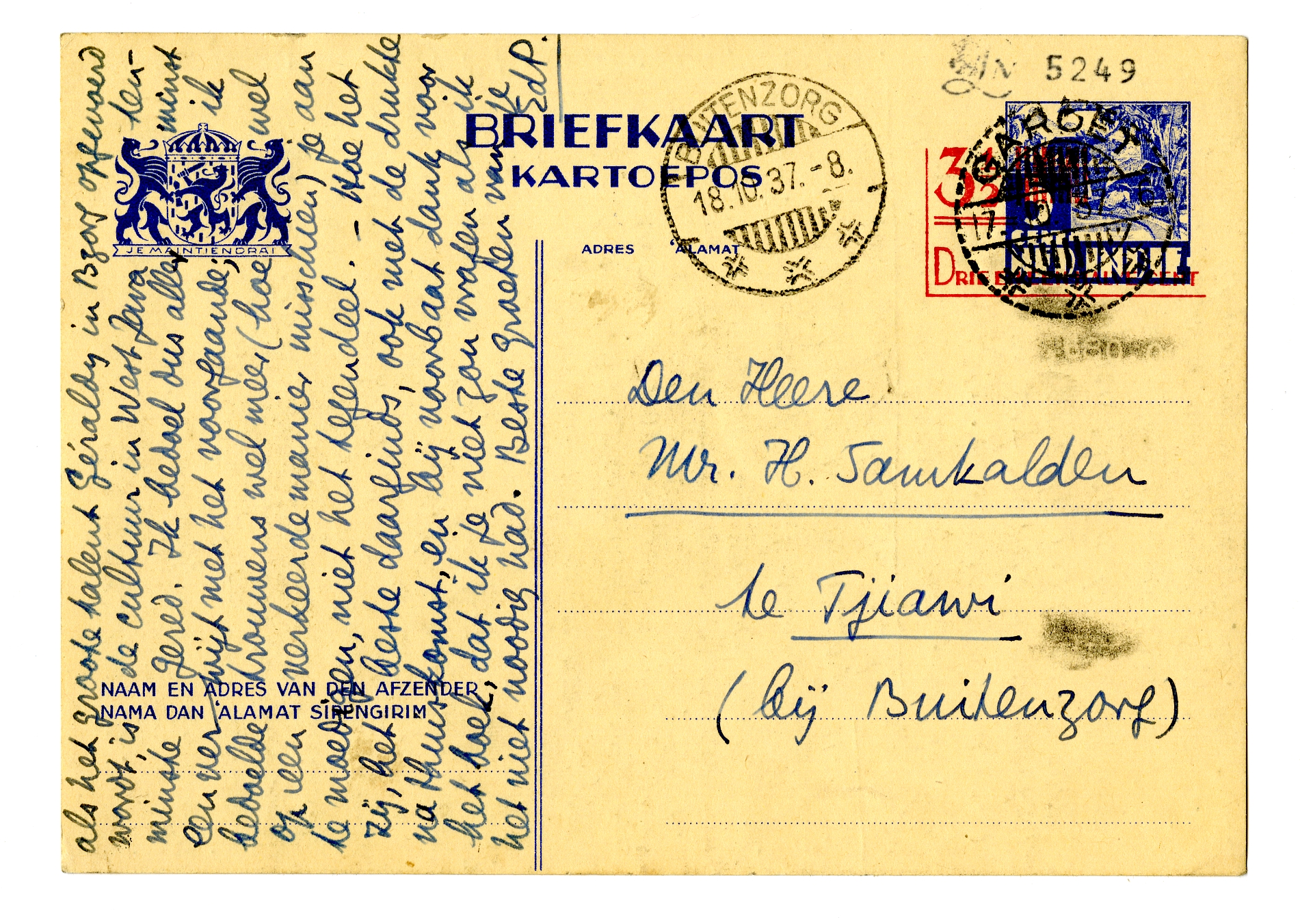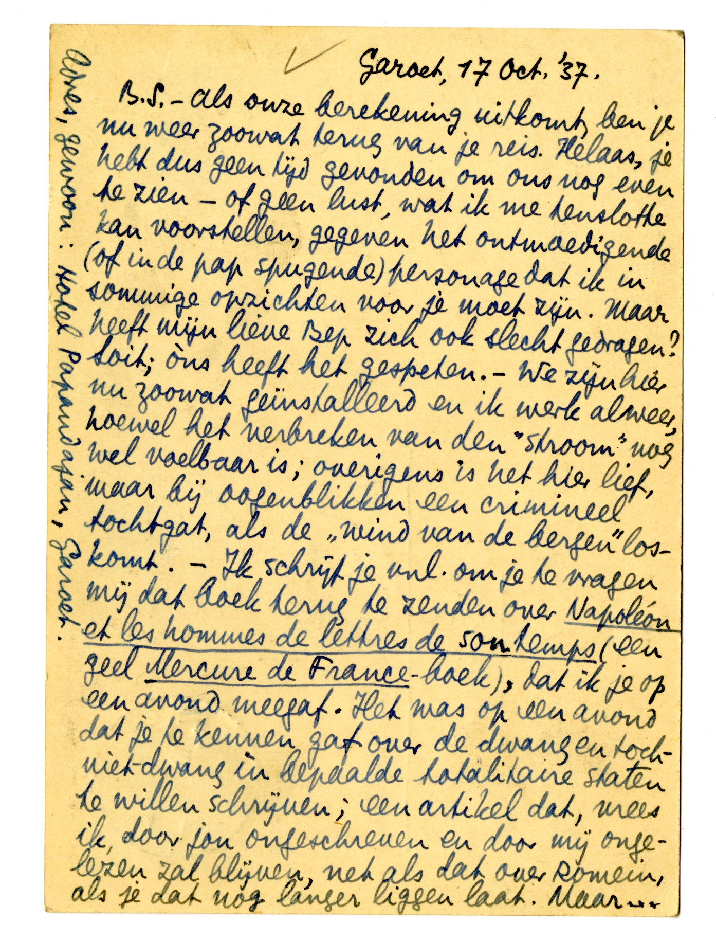 B.S. - Als onze berekening uitkomt ben je nu weer zoowat terug van je reis. Helaas, je hebt dus geen tijd gevonden om ons nog even te zien - of geen lust, wat ik me tenslotte kan voorstellen, gegeven het ontmoedigende (of in de pap spugende) personage dat ik in sommige opzichten voor je moet zijn. Maar heeft mijn lieve Bep zich ook slecht gedragen? Soit; òns heeft het gespeten. - We zijn hier nu zoowat geïnstalleerd en ik werk alweer, hoewel het verbreken van den ‘stroom’ nog wel voelbaar is; overigens is het hier lief, maar bij oogenblikken een crimineel tochtgat, als de ‘wind van de bergen’ loskomt. - Ik schrijf je vnl. om je te vragen mij dat boek terug te zenden over Napoléon et les hommes de lettres de son temps (een geel Mercure de Fratice-boek), dat ik je op een avond meegaf. Het was op een avond dat je te kennen gaf over de dwang en toch-niet-dwang in bepaalde totalitaire staten te willen schrijven; een artikel dat, vrees ik, door jou ongeschreven en door mij ongelezen zal blijven, net als dat over Romein, als je dat nog langer liggen laat. Maar... als het groote talent Géraldy in Bzorg opgevoerd wordt, is de cultuur in West Java tenminste gered. Ik bedoel dus allerminst een verwijt met het voorgaande; ik bedoelde trouwens veel meer (hoewel op een verkeerde manier misschien) je aan te moedigen, niet het tegendeel. - Hoe het zij, het beste daarginds, ook met de drukte na thuiskomst, en bij voorbaat dank voor het boek, dat ik je niet zou vragen als ik het niet noodig had. Beste groeten van je