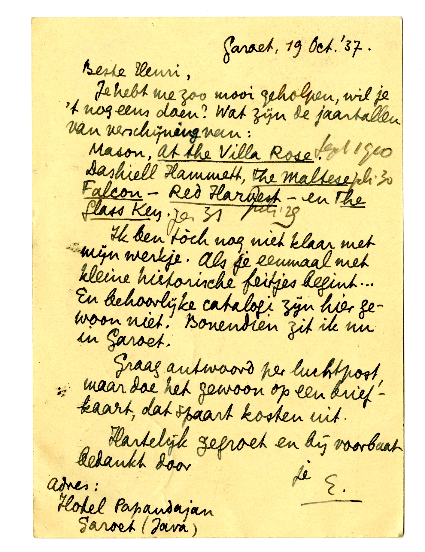 Ik ben tòch nog niet klaar met mijn werkje. Als je eenmaal met kleine historische feitjes begint... En behoorlijke catalogi zijn hier gewoon niet. Bovendien zit ik nu in Garoet.