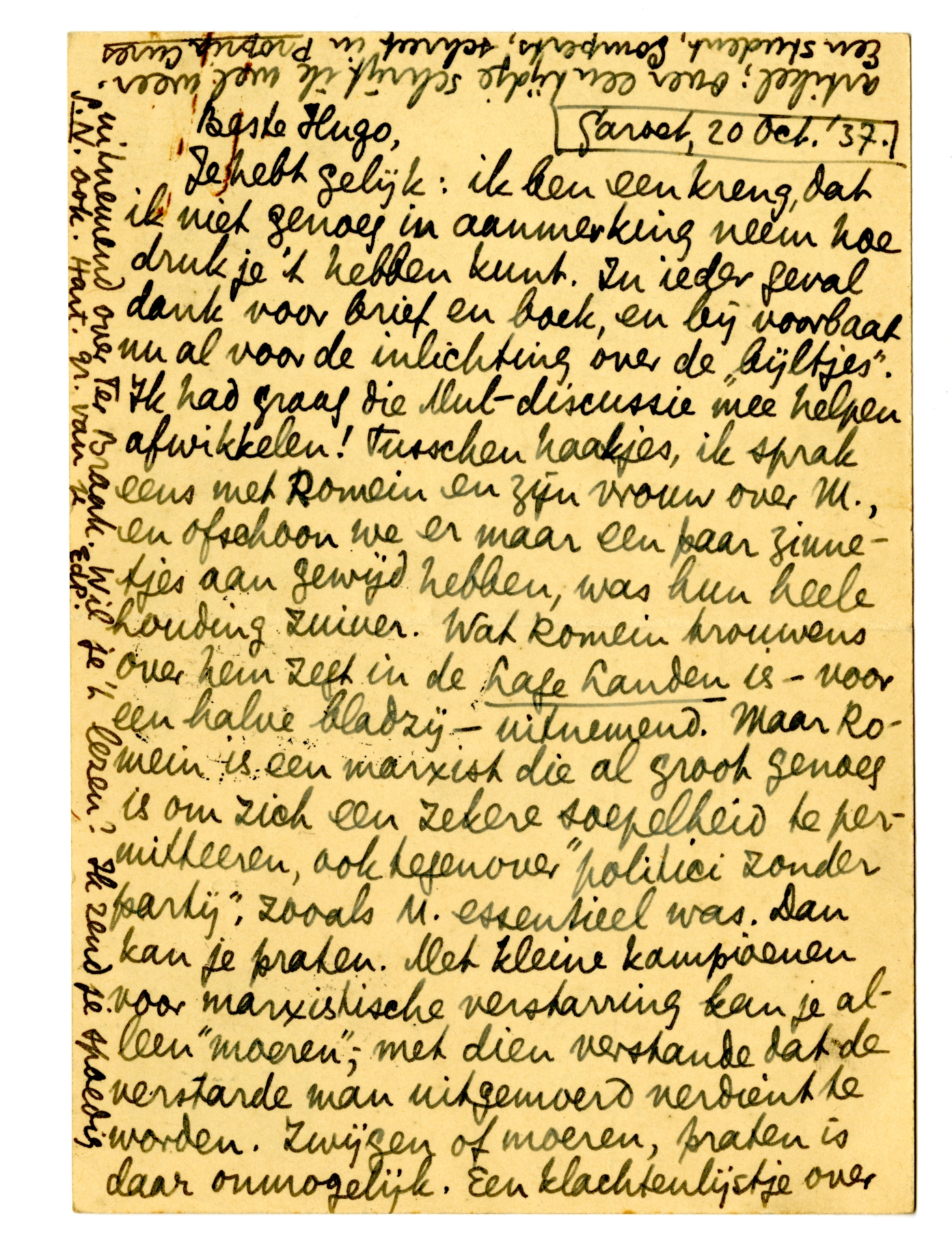 Je hebt gelijk: ik ben een kreng, dat ik niet genoeg in aanmerking neem hoe druk je 't hebben kunt. In ieder geval dank voor brief en boek, en bij voorbaat nu al voor de inlichting over de ‘bijltjes’. Ik had graag die Mul-discussie mee helpen afwikkelen! Tusschen haakjes, ik sprak eens met Romein en zijn vrouw over M., en ofschoon we er maar een paar zinnetjes aan gewijd hebben, was hun heele houding zuiver. Wat Romein trouwens over hem zegt in de Lage Landen is - voor een halve bladzij - uitnemend. Maar Romein is een marxist die al groot genoeg is om zich een zekere soepelheid te permitteeren, ook tegenover ‘politici zonder partij’, zooals M. essentieel was. Dan kan je praten. Met kleine kampioenen voor marxistische verstarring kan je alleen ‘moeren’; met dien verstande dat de verstarde man uitgemoerd verdient te worden. Zwijgen of moeren, praten is daar onmogelijk. Een klachtenlijstje over alles wat M. niet geweest is volgens voorschrift van, niet ‘begrepen’ heeft van de geschriften door ‘Karel’ Marx, is doodgewoon imbeciel. Laten ze zulke methodetjes op Casimir of Jan Ligthart toepassen, of op de begaafde kwee Van Eeden, voor mijn part. - De Onzekeren, verh. I schiet nu geweldig op, al wordt mij iederen morgen een goed uur slaap ontroofd door 't Alijntje. Wat een pest dat het zóó warm is op Batavia. Je maakt me bang, in het bijzonder voor Bep. - Benieuwd naar je artikel; over een tijdje schrijf ik wel weer. Een student, Gomperts, schreef in Propria Cures4957 uitnemend over Ter Braak. Wil je 't lezen? Ik zend je spoedig G.N. ook. Hart. gr. van je