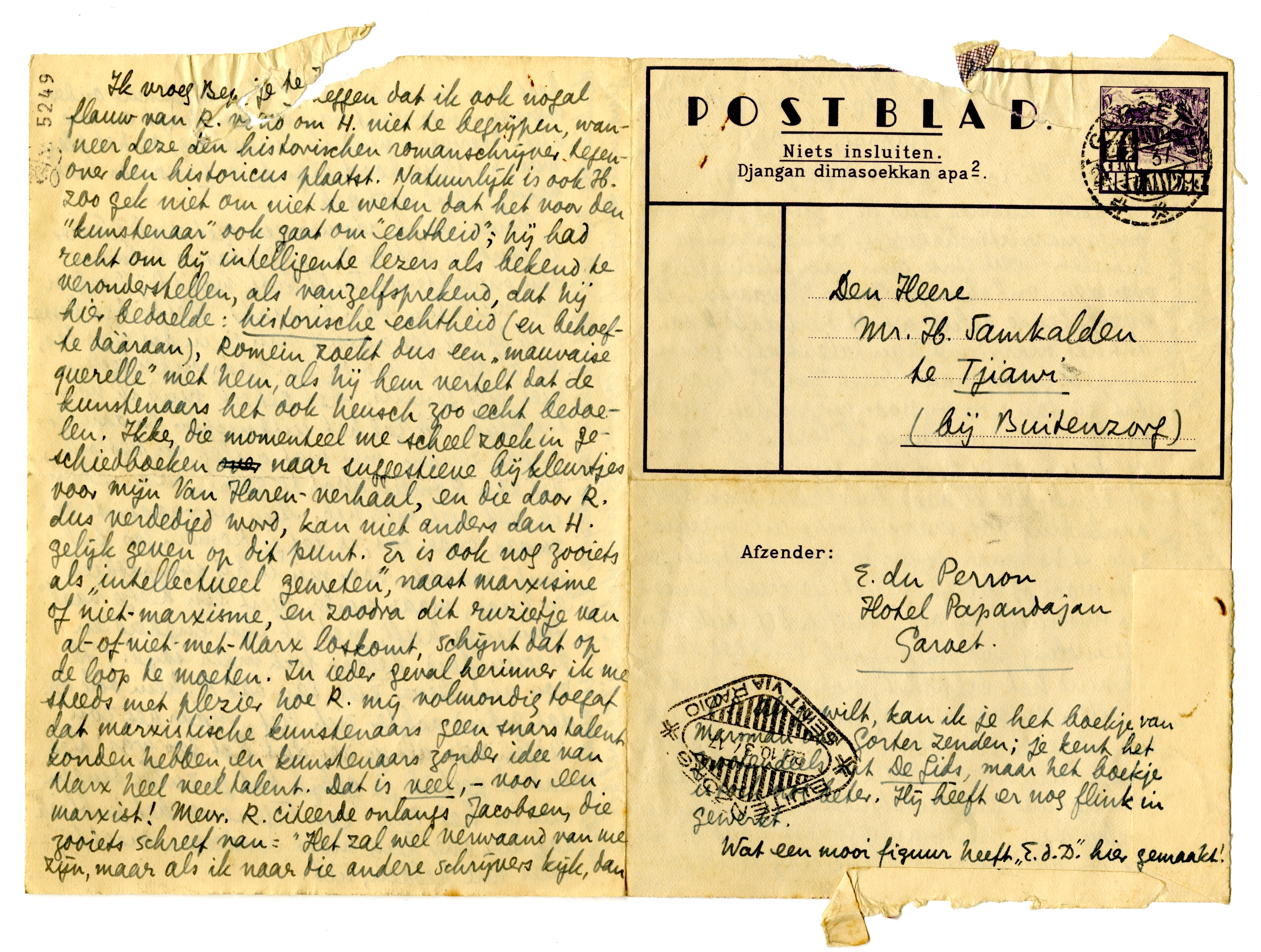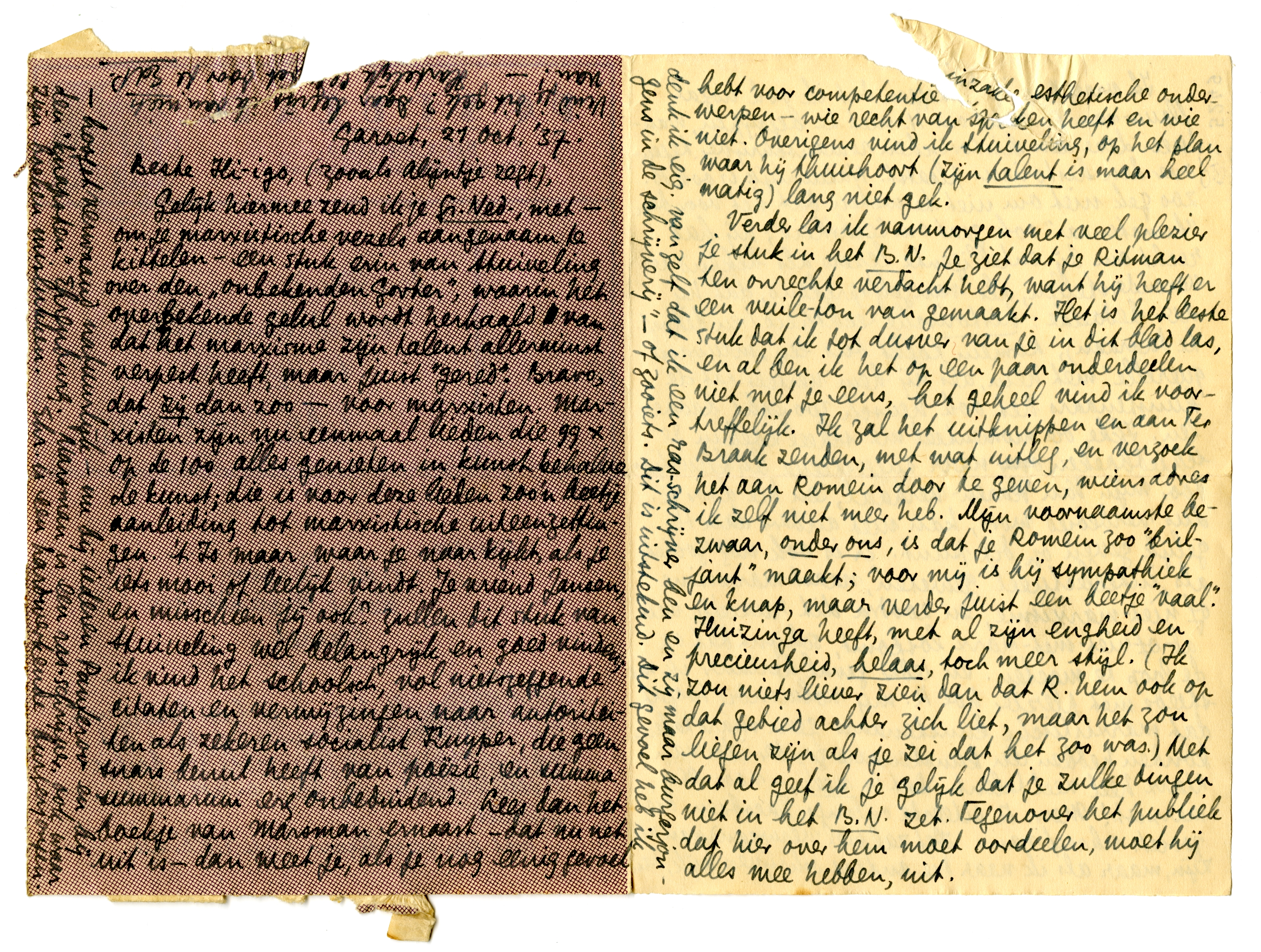 Verder las ik vanmorgen met veel plezier je stuk in het B.N.4959 Je ziet dat je Ritman ten onrechte verdacht hebt, want hij heeft er een vuile-ton van gemaakt. Het is het beste stuk dat ik tot dusver van je in dit blad las, en al ben ik het op een paar onderdeden niet met je eens, het geheel vind ik voortreffelijk. Ik zal het uitknippen en aan Ter Braak zenden, met wat uitleg, en verzoek het aan Romein door te geven, wiens adres ik zelf niet meer heb. Mijn voornaamste bezwaar, onder ons, is dat je Romein zoo ‘briljant’ maakt; voor mij is hij sympathiek en knap, maar verder juist een beetje ‘vaal’. Huizinga heeft, met al zijn engheid en precieusheid, helaas, toch meer stijl. (Ik zou niets liever zien dan dat R. hem ook op dat gebied achter zich liet, maar het zou liegen zijn als je zei dat het zoo was.) Met dat al geef ik je gelijk dat je zulke dingen niet in het B.N. zet. Tegenover het publiek dat hier over hem moet oordeelen, moet hij alles mee hebben, uit.